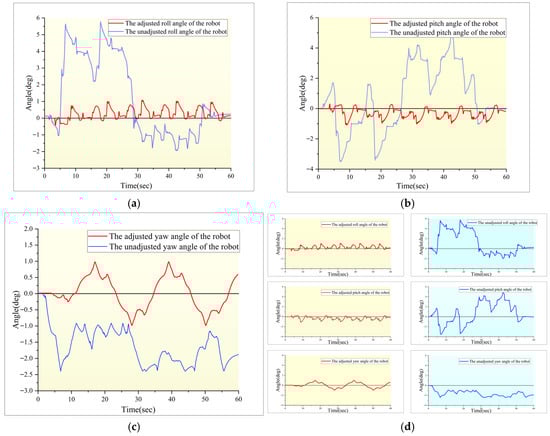 Comparison of Euler angles before and after adjustment of a robot prototype. (a) Roll angle curves before and after robot pose adjustment. (b) Pitch angle curves before and after robot pose adjustment. (c) Yaw angle curves before and after robot pose adjustment. (d) All angle curves before and after robot pose adjustment.