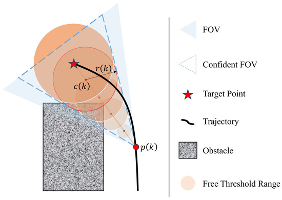 - VisibilityVisibility is a metric designed to quantify the level of occlusion within the UAV’s field of view (FOV) [25]. When the occluded area within the FOV exceeds a threshold, the environmental information available to the operator will significantly diminish, thereby affecting decision-making efficiency. As shown in Figure 1, the UAV trajectory point , and the target position . It is assumed that the UAV always faces the target. The blue area in the figure is the UAV’s FOV, and the blue dashed area is defined as the confident FOV, i.e., the core observation area where no occlusion is required in the ideal state. Considering that the computational complexity of the analytical solution for the occluded area of obstacles in the FOV is extremely high, we approximate the visibility by constructing a series of spherical regions , where N is the total number of spherical regions. The center and radius of the spherical regions are defined as given in (13):where , and is a parameter related to the size of the FOV. The visibility of the FOV is measured by comparing the minimum distance from the center point to the nearest obstacle with the radius of the corresponding sphere. The visibility of each area is ensured by the following condition, as given in (14):where denotes the minimum distance from to the nearest obstacle. Accordingly, the visibility factor at time k is defined as given in (15):