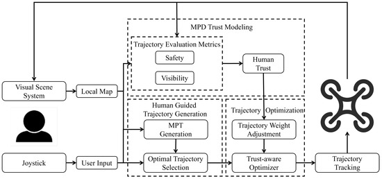 The framework diagram presents a human–UAV system for assistive aerial teleoperation that incorporates human trust into trajectory planning. The system uses human input to guide trajectory planning and generate an initial trajectory while simultaneously modeling human trust via the MPD trust model. Subsequently, the system optimizes the initial trajectory to match the dynamic trust level, ultimately forming an optimized path for UAV trajectory tracking.