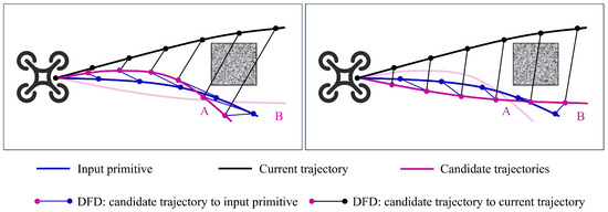 Illustration of the calculation of discrete Fréchet distance (DFD) in trajectory selection. The DFD of each candidate trajectory with respect to the operator input primitives and the current trajectory is calculated.