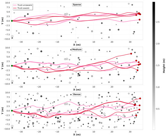 Finally, the average trust metric directly validates the effectiveness of our trust-aware approach. In all environments, the average trust level of operators was significantly higher with the trust-aware method compared to the trust-unaware baseline. For example, in the medium-density environment, the trust-aware method achieved an average trust of 0.750 compared to 0.657 for the trust-unaware method. Trust levels for both methods decreased as environmental complexity increased, which is expected due to the greater challenges in denser settings. However, the decline was gentler for the trust-aware method (e.g., from 0.813 in the sparse environment to 0.693 in the dense environment compared to a steeper drop from 0.744 to 0.611 for the trust-unaware method). This suggests that by actively modeling and adapting to the operator’s trust state, our system establishes and maintains a more robust and resilient human–machine trust relationship. The higher trust levels both result from and contribute to the benefits observed (fewer inputs, smoother trajectories). As the system’s behavior becomes more reliable and predictable, operators are more willing to reduce interventions, creating a virtuous cycle.
