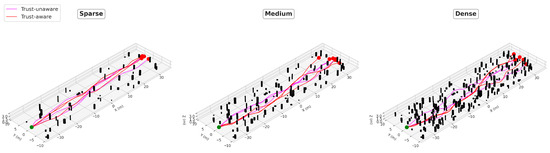 In terms of fundamental task completion metrics, both methods exhibit comparable performance across all environments. Specifically, flight distance and duration show no significant differences between the trust-aware and trust-unaware approaches. For instance, in the dense environment, the trust-aware method recorded a flight distance of 71.38 m and a duration of 49.86 s, compared to 71.73 m and 54.89 s for the trust-unaware method. Similar trends are observed in the sparse and medium environments, indicating that incorporating the trust model does not compromise basic task execution efficiency. Both methods guide the UAV to plan effective paths of similar lengths, where the paths for both methods closely align in terms of overall distance across sparse, medium, and dense settings. However, the trust-aware method demonstrates a slight advantage in average velocity, particularly in the dense environment. This improvement is primarily attributed to smoother flight trajectories and fewer unnecessary pauses. The trust-aware method produces paths with fewer sharp turns and abrupt changes compared to the trust-unaware baseline, especially in the dense environment, enhancing the overall efficiency of motion.