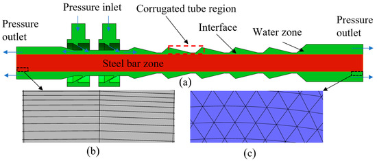 Computational model for steel bar cooling: (a) computational domain and boundary conditions, (b) computational mesh of the steel bar, (c) computational mesh of the fluid domain.