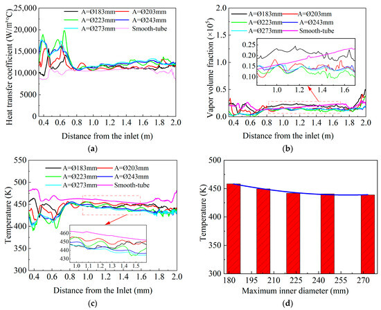 Figure 4 illustrates the variation in heat transfer coefficient, vapor volume fraction, and temperature with the maximum inner diameter A of the corrugated tube. The heat transfer coefficient increases with a larger A, whereas the water vapor volume fraction and temperature decrease. In the inlet section (0.3–0.6 m), impingement of cooling water from the annular gap onto the steel surface produces higher heat transfer coefficients and vapor volume fractions, along with relatively lower temperatures. Within the corrugated section (0.6–1.6 m), the corrugation enhances turbulence, resulting in pronounced fluctuations in both heat transfer coefficient and vapor volume fraction. In the outlet section (1.6–2.0 m), near the exit, the heat transfer coefficient decreases and then stabilizes. Overall, the cooling performance improves with increasing maximum inner diameter A, and eventually reaches a plateau. Compared with smooth tubes at the same flow rate, the designed corrugated tubes increased heat transfer performance by 13%, 19%, 48%, 55%, and 61% for A = 183 mm, 203 mm, 233 mm, 246 mm, and 273 mm, respectively. Using the Nusselt number of a smooth tube as the reference for normalization, the results show that the normalized Nusselt numbers of the corrugated tubes exceed 1, reaching a maximum of 1.68. This enhancement primarily results from the change in the corrugated tube angle induced by the maximum inner diameter A, which intensifies turbulence.
