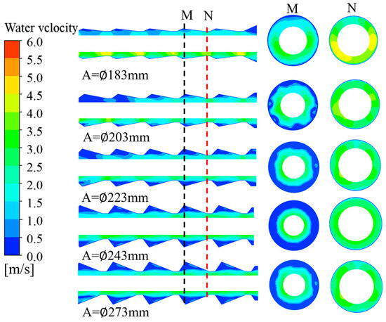 Figure 5 presents the axial velocity contours of cooling water for different maximum inner diameters (A). Subfigure M shows the velocity contours in the contraction section. As A increases, the velocity contours display a lobed pattern, indicating stronger disruption of the vapor film on the steel bar surface. Subfigure N shows the velocity contours in the expansion section, where the overall axial velocity decreases. When the inner diameter is too small, the contraction angle decreases, reducing the shear velocity of the cooling water. Under these conditions, a continuous vapor film tends to form on the steel bar surface. At small inner diameters, the limited amplitude of the corrugations generates insufficient disturbances to break the vapor film. Since the vapor film has very low thermal conductivity, it acts as an insulating layer, preventing the cooling water from adequately contacting the bar surface. Although the flow velocity is high, heat transfer at the wall is dominated by the insulating effect of the vapor film, resulting in low heat transfer efficiency.