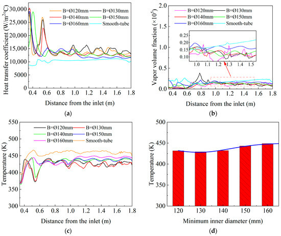 Effect of different minimum inner diameters on the cooling efficiency of steel bars: (a) heat transfer coefficient, (b) vapor volume fraction, (c) axial temperature distribution, (d) variation in temperature with minimum inner diameters.