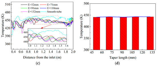 Figure 8 illustrates the trends of the heat transfer coefficient, vapor volume fraction, and temperature with varying taper length (E) of the corrugated tube. The heat transfer coefficient, water vapor volume fraction, and temperature all exhibit periodic fluctuations with similar amplitudes as the taper length increases, with temperature variations being relatively minor. At 1400 mm from the inlet, the intense turbulence generated by the inlet annular gap exerts a negligible effect on the flow field within the corrugated tube. The maximum temperature variation of the steel bar is approximately 2 K, showing that the taper length has a limited impact on the cooling performance of the corrugated tube. Compared to the basic smooth tube, the designed corrugated tube exhibits enhanced heat exchange performance at the same flow rate, with E = 52 mm, 71 mm, 92 mm, 110 mm, and 132 mm yielding improvements of 58%, 33%, 15%, 12%, and 52%, respectively. The normalized Nusselt number, using the smooth tube as a reference, indicates values greater than 1, reaching a maximum of 1.58. This enhancement primarily results from the large trough of the corrugated tube created by the cone length E, positioned at either the inflow or outflow section.