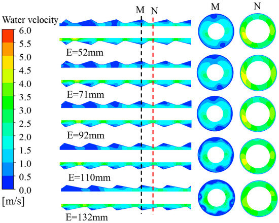Figure 9 shows the axial velocity contour plots of cooling water for different taper lengths (E). As E varies, the contraction and expansion angles change simultaneously. Specifically, for E = 52 mm, 71 mm, 90 mm, 110 mm, and 150 mm, the corresponding (contraction angle, expansion angle) pairs are (32°, 15°), (24°, 18°), (19°, 22.5°), (16°, 28.5°), and (12°, 60°), respectively. For E = 52 mm and E = 110 mm, the large wave troughs are located on the inflow side, and the cooling water exhibits nearly equal velocities at cross-sections M and N. The corresponding Nusselt numbers are 58% and 52%, differing by 6%, and the expansion and contraction angles are approximately interchangeable. For E = 71 mm and E = 92 mm, the large wave valleys are positioned on the downflow side, with similar cooling water velocities and a Nusselt number difference of 3%. This enhancement mainly arises from the big trough of the corrugated tube introduced by the cone length E, located at the inflow or outflow measurement.