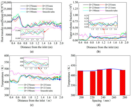Figure 10 illustrates the trends of the heat transfer coefficient, vapor volume fraction, and temperature with varying corrugated tube spacing. Between 0.6 m and 1.6 m from the inlet, the heat transfer coefficient exhibits wavy fluctuations due to the corrugations, generally increasing first and then decreasing as the pitch decreases. Intense turbulence generated at the inlet annular gap around 1400 mm has minimal impact on the flow field within the corrugated tube. As a result, the flow disturbance from the inlet region has little effect on the corrugated tube flow, and the water vapor volume fraction remains relatively stable throughout. Compared to the basic smooth tube at the same flow rate, the designed corrugated tube increases the Nusselt number by 16%, 53%, 50%, and 11% for D = 251 mm, 234 mm, 211 mm, and 198 mm, respectively. For D = 276 mm, the Nusselt number decreases by 8%, mainly due to the excessive distance between the large wave troughs, which weakens turbulence enhancement. Using the Nusselt number of the smooth tube as a benchmark, the normalized Nusselt number of the corrugated tube under the study conditions exceeds 1 in four cases, reaching a maximum of 1.8. This improvement is primarily attributed to the variation in turbulence frequency induced by the spacing D.
