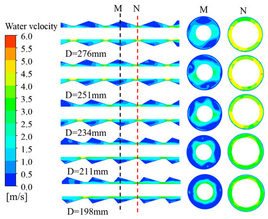 Velocity contour plots of cooling water for different maximum inner diameters of the corrugated tube.