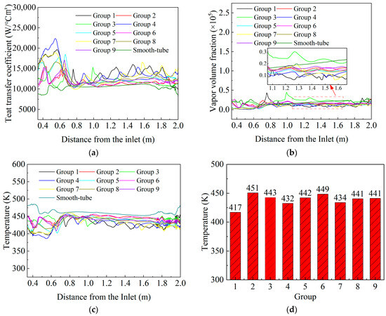 Figure 12 shows the variation trends of heat transfer coefficient, vapor volume fraction, and temperature under nine different corrugated tube parameter sets. When the minimum inner diameter B is ∅130 mm, the average surface temperature of the rod material decreases by 20 K compared with B values of ∅150 mm and ∅160 mm. The minimum inner diameter B has the greatest influence on the cooling efficiency of the rod material. In the designed orthogonal simulation, three factors and their corresponding level combinations were considered, resulting in a total of nine simulation sets. Comparing the heat transfer performance of different combinations reveals that the first set of solutions performs best, improving heat transfer by approximately 65% compared with the benchmark smooth tube. It also surpasses the results of the other simulation groups. This indicates that the combination more effectively enhances turbulence and promotes convective heat transfer, making it the optimal structural parameter set in this study. The best parameters for the cooling efficiency of a bar with a diameter of Φ100 mm are A = Φ203 mm, B = Φ130 mm, and D = 198 mm.
