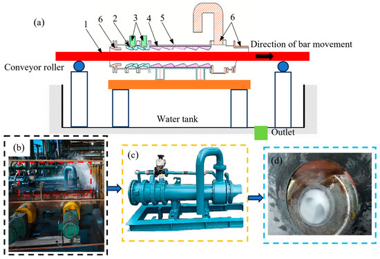 The experimental platform consists of a Tempcore cooler, as shown in Figure 13, including the following components: 1—steel bar, 2—inlet water port, 3—inlet guide vane, 4—intermediate tube, 5—corrugated tube, and 6—outlet. The experimental procedure primarily involves supplying cooling water through the inlet water port, where it is sprayed onto the steel bar surface via an annular gap. The cooling water then accelerates the steel bar’s cooling through the corrugated tube. After natural air cooling on the cooling bed, the tempered martensite content of the cooled steel bar is measured and compared with the martensite content predicted by simulation.