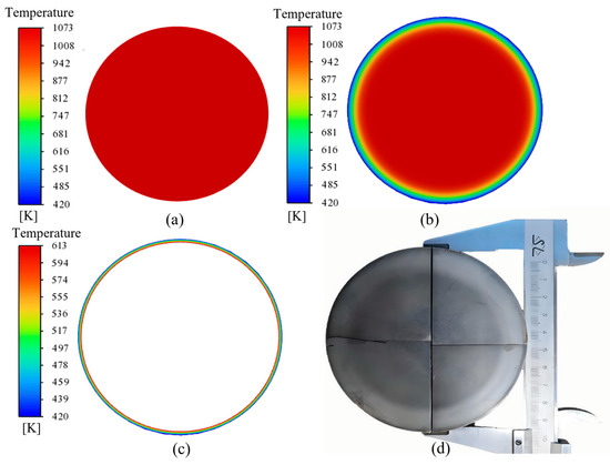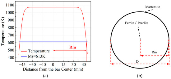 RM is defined as the boundary point where the temperature drops to the martensite start temperature of 613 K. Figure 14 illustrates the continuous temperature distribution after rapid cooling of the steel bar, which is used to validate the determination of Rm by the thermal model.