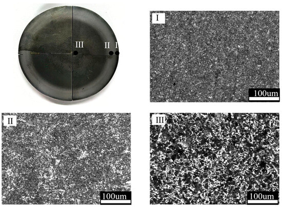 Figure 16 presents the tempered martensite boundary microstructure obtained from the post-rolling heat-core tempering and cooling experiment of the steel bar. A distinct tempered martensite boundary layer is observed on the outer surface of the bar section. The experiment also identifies typical microstructural features, including tempered martensite (Region Ⅰ), bainite (Region Ⅱ), and a mixed ferrite–pearlite microstructure (Region Ⅲ).