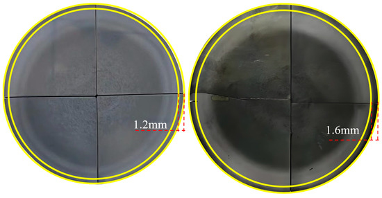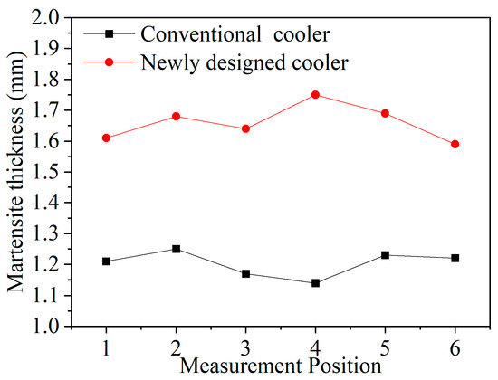 Figure 17 presents the martensite thickness measured at 60° intervals, with average values calculated. The mean thicknesses for the traditional cooler and the newly designed cooler are 1.20 mm and 1.66 mm, respectively. The deviation in martensite thickness is primarily due to local errors during metallographic sample preparation, which affect the accuracy of microscopic observation, as well as environmental influences after cooling.