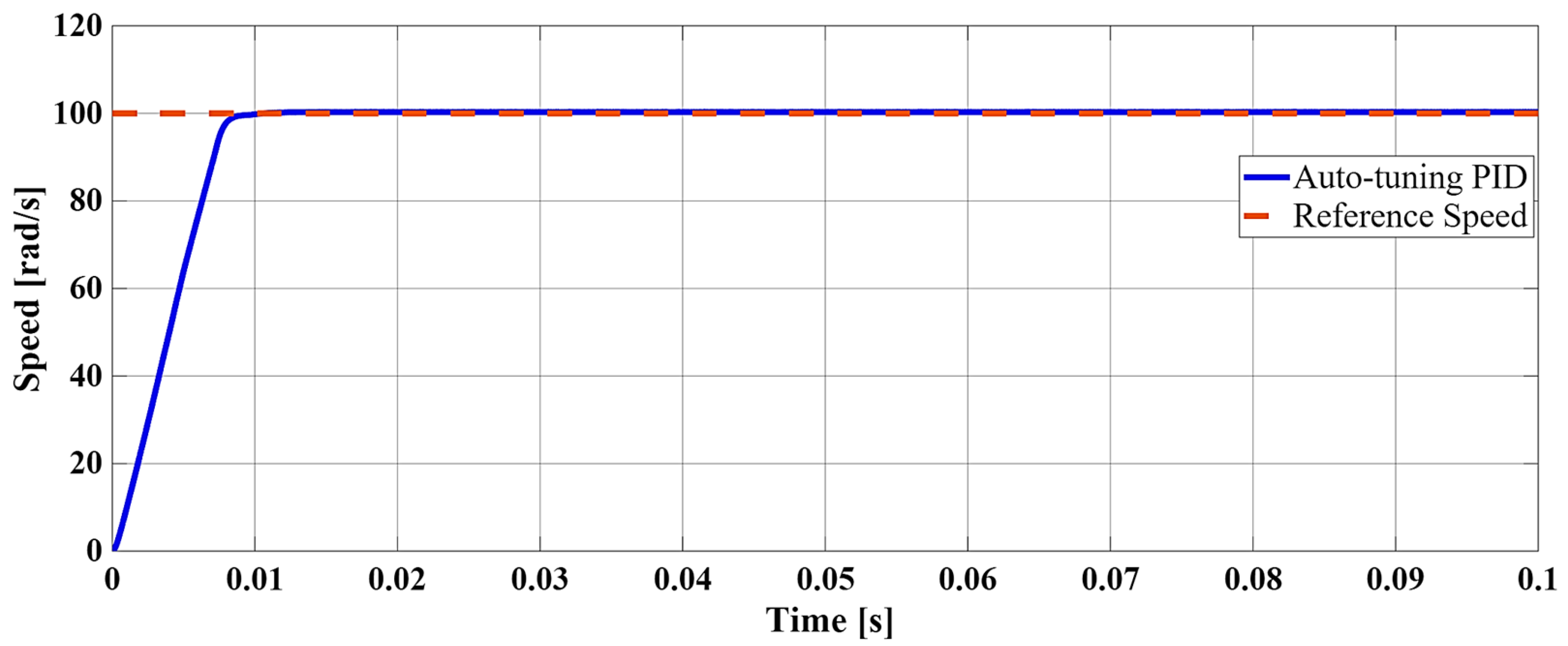 Figure 4 illustrates the performance of the auto-tuning PID controller at a reference speed of 100 rad/s under no-load conditions. As shown, the system rapidly reaches the reference speed without any overshoot, confirming the controller’s capability to provide stable and accurate speed tracking even in the absence of a load. A closer inspection of the initial transient interval reveals that the reference speed is attained within a short rise time, with no noticeable oscillatory behavior. The smooth transient response highlights the effectiveness of the dual-Jacobian-based gain adaptation mechanism in minimizing overshoot and ensuring fast convergence. Compared to conventional fixed-gain tuning approaches, this behavior indicates a more responsive and well-damped dynamic performance, even during the startup phase. Minor oscillations, if any, are quickly damped, demonstrating the robustness of the proposed control strategy for steady-state operation.