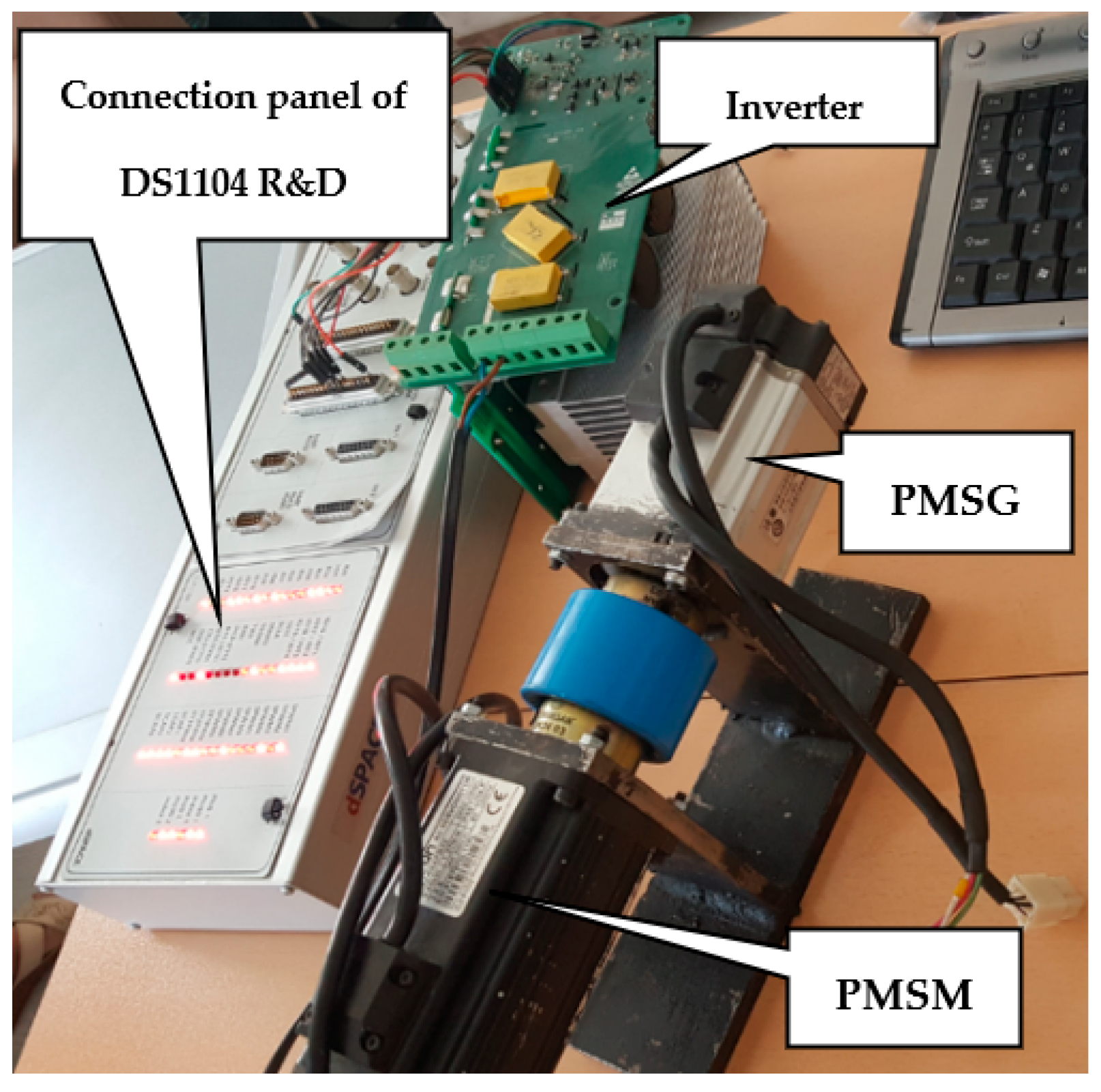 The dSPACE DS1104 controller board (dSPACE GmbH, Paderborn, Germany)was utilized for conducting real-time experimental studies. The experimental setup consists of a PMSM for speed control and a second permanent magnet synchronous generator (PMSG) coupled to the PMSM to serve as a controllable load, enabling investigation of dynamic motor behavior under realistic operating conditions. As illustrated in