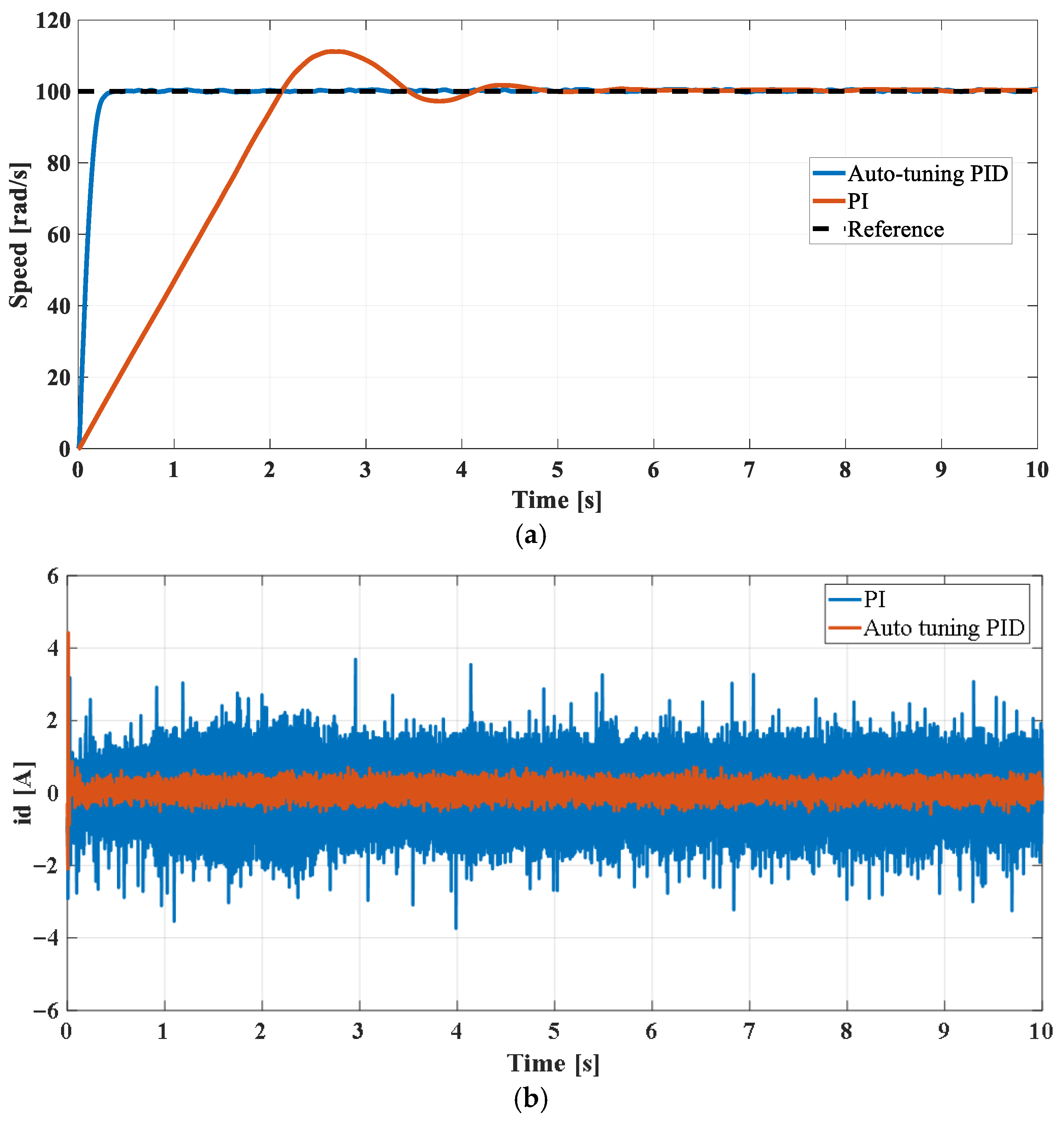 Figure 7a shows that the auto-tuning PID controller rapidly tracks the desired reference speed without overshoot, exhibiting a short settling time and negligible steady-state error, highlighting its ability to dynamically adjust gains in real time to compensate for nonlinearities. Conversely, the conventional PI controller reaches the reference speed within approximately 2 s with minimal overshoot, while the settling time is observed to be approximately 5 s.