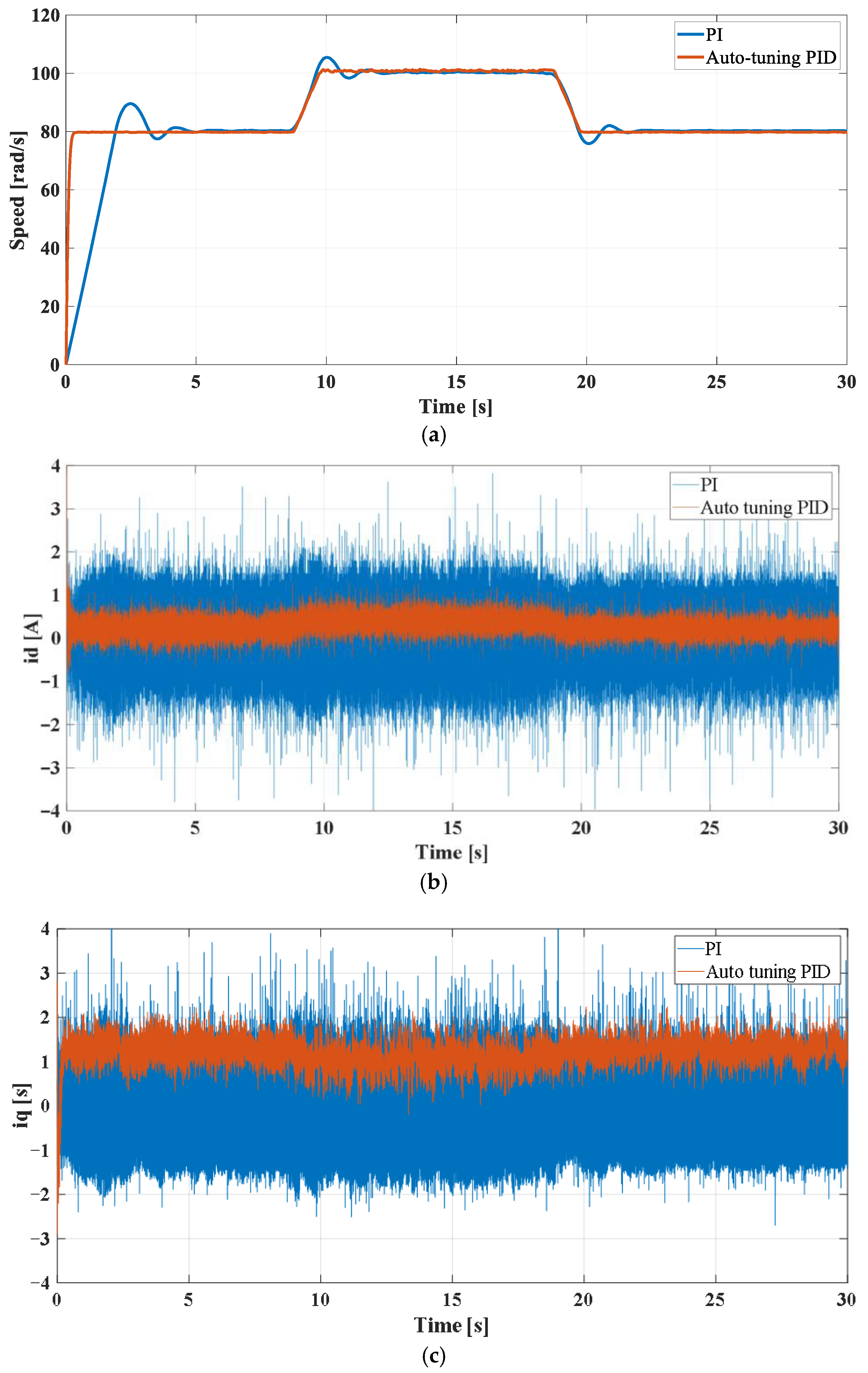 Figure 8b,c show the corresponding d-axis (id) and q-axis (iq) current responses, respectively. Although the PI controller is able to reach the desired speed levels with relatively small speed deviations, noticeable oscillations are observed in both the id and iq currents, indicating reduced robustness under dynamic operating conditions.