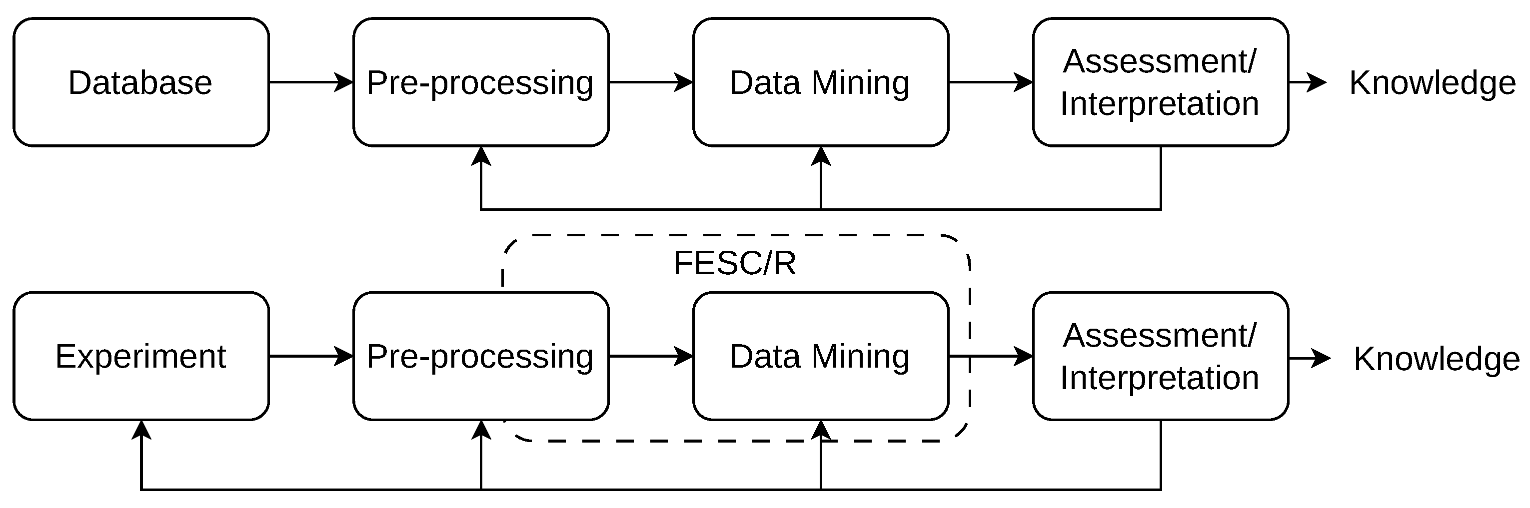 Figure 1. Comparison of the knowledge discovery frameworks KDD (top) and KDED (bottom).