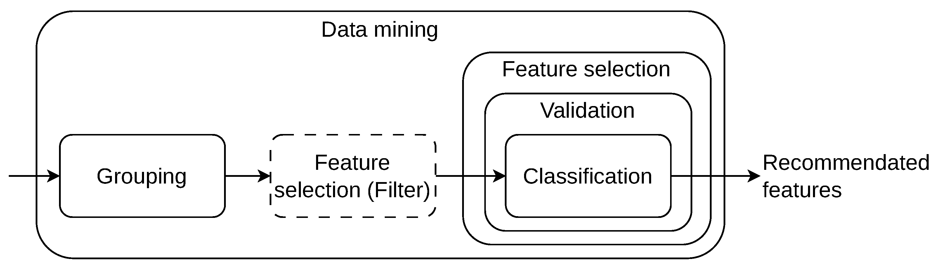 Data mining is the next step once the feature pool is available. It is the central step in KDED, in which an algorithm lists all the recommended feature vectors that are capable of classifying the data correctly. The step is described in Figure 4. With grouping, the target and the conditions for the feature selection are set. This is achieved by rearranging the prime classes that contain data from a single condition sampled in the experiment. By merging a target class and one or several disturbance classes, new and more complex classes arise. With this measure, the feature selection algorithm is forced to select only robust features that allow for classification under realistic circumstances. As previously mentioned regarding experiments that consider the major influences on a system, the amount of data quickly increases. In addition, valuable results can only be achieved with an exhaustive search. As a result, the execution time can drastically increase. To keep feature selection executable, a reduction in the feature pool may be necessary. There are several papers that focus on hybrid search strategies [60] and especially on the selection and configuration of a pre-filter [61]. The challenge in the application of pre-filters is the need to drop only features without any information. For proper feature selection, a wrapper algorithm is used. This class of search algorithm involves a classifier and its classification result as the criteria. According to [39], the advantages of doing this are as follow: