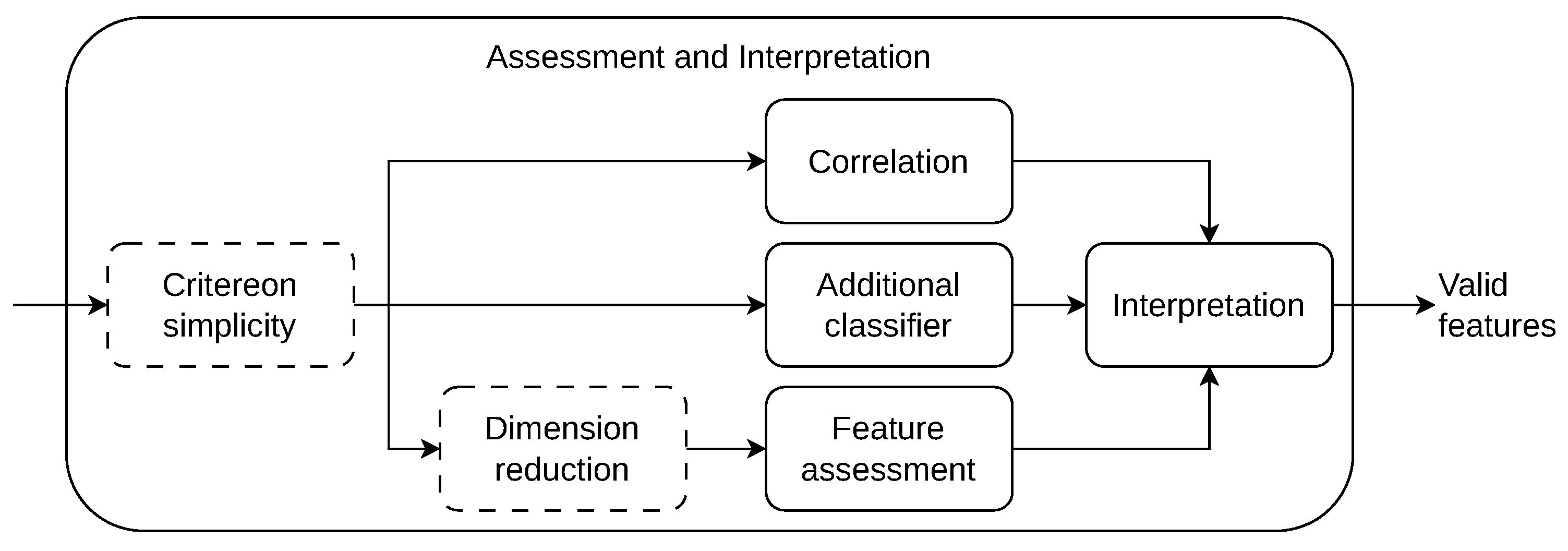 The final step of KDED is assessment and interpretation. This step is conducted when a search algorithm has created a recommendation list of feature vectors. It is important to emphasize that the data mining step only delivers recommendations because the results have not been checked for plausibility. In order to validate the recommendations and achieve a broad understanding of them, Figure 5 shows the criteria and the structure used to apply them. Depending on the search algorithm and its parameters, the number of features for each feature vector can vary. As a first measure, simplicity helps to reduce the list. Simplicity means that in the case of two feature vectors that have the same classification error, the one with fewer features is more valuable [10]. In addition, less complex feature vectors are easier to interpret in the sense of KDED. As a threshold, Equation (1) is applied: