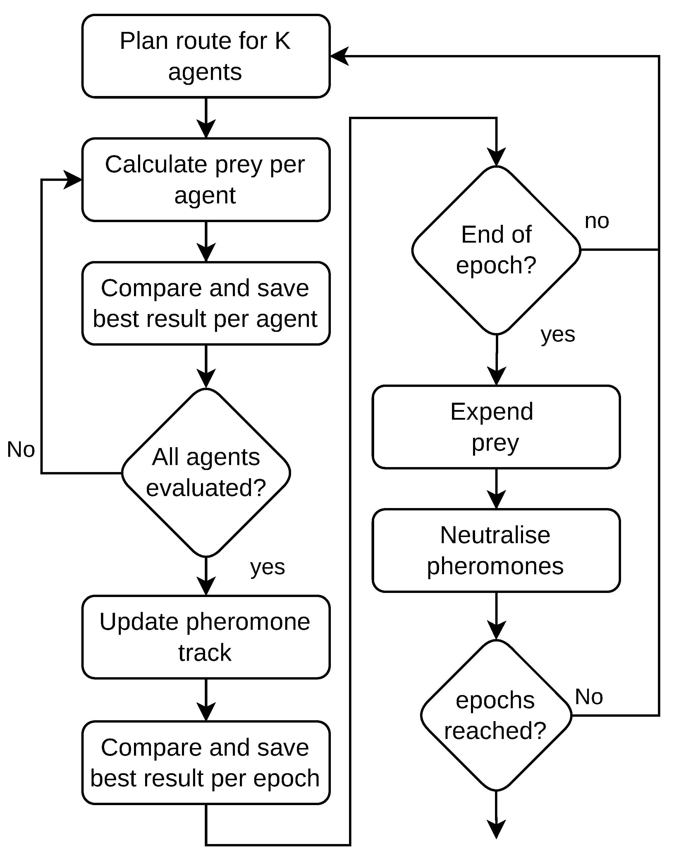 where e r r is the classification error and m the number of features. The result is compared with the best result to date. If the new result is better, it is saved together with the feature vector; otherwise, it is discarded. When all agents have been evaluated, the pheromone levels of the best vector’s features are updated. The best result of the competition cycle is compared with the best result to date of the epoch cycle, and if the new result is better, it is saved together with the feature vector; otherwise, it is discarded. The update is followed by checking for the end of the epoch. The following abortion criteria are possible: