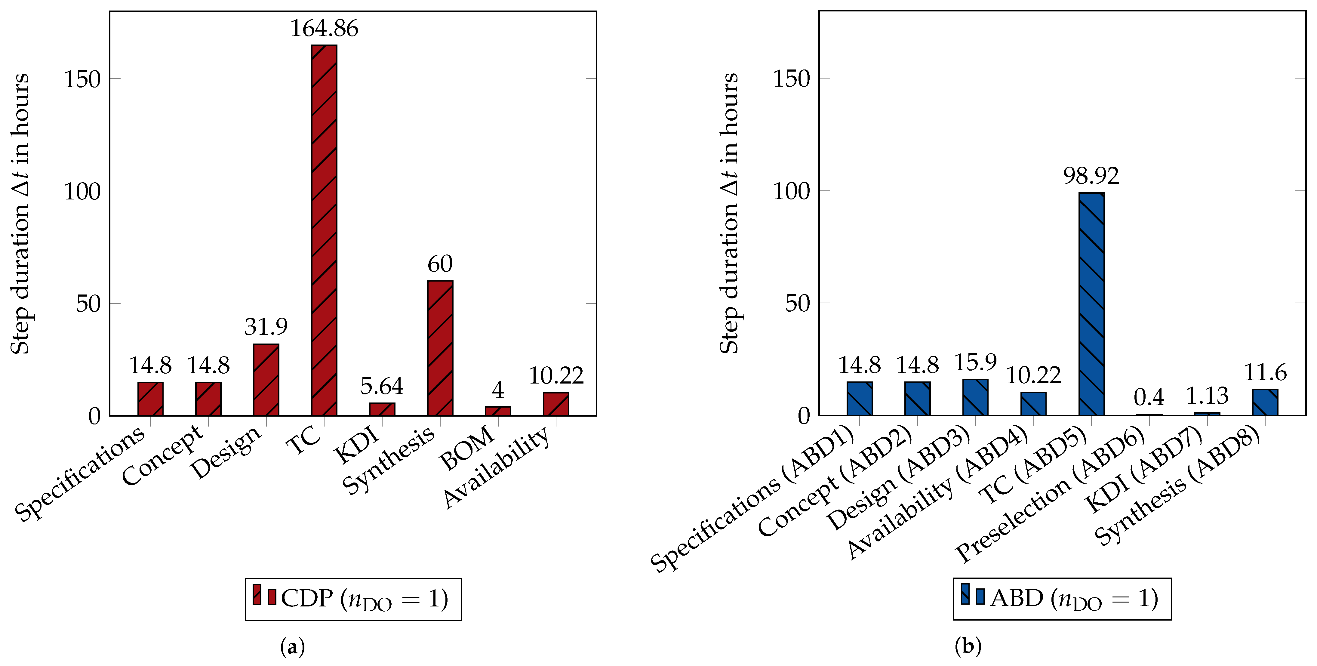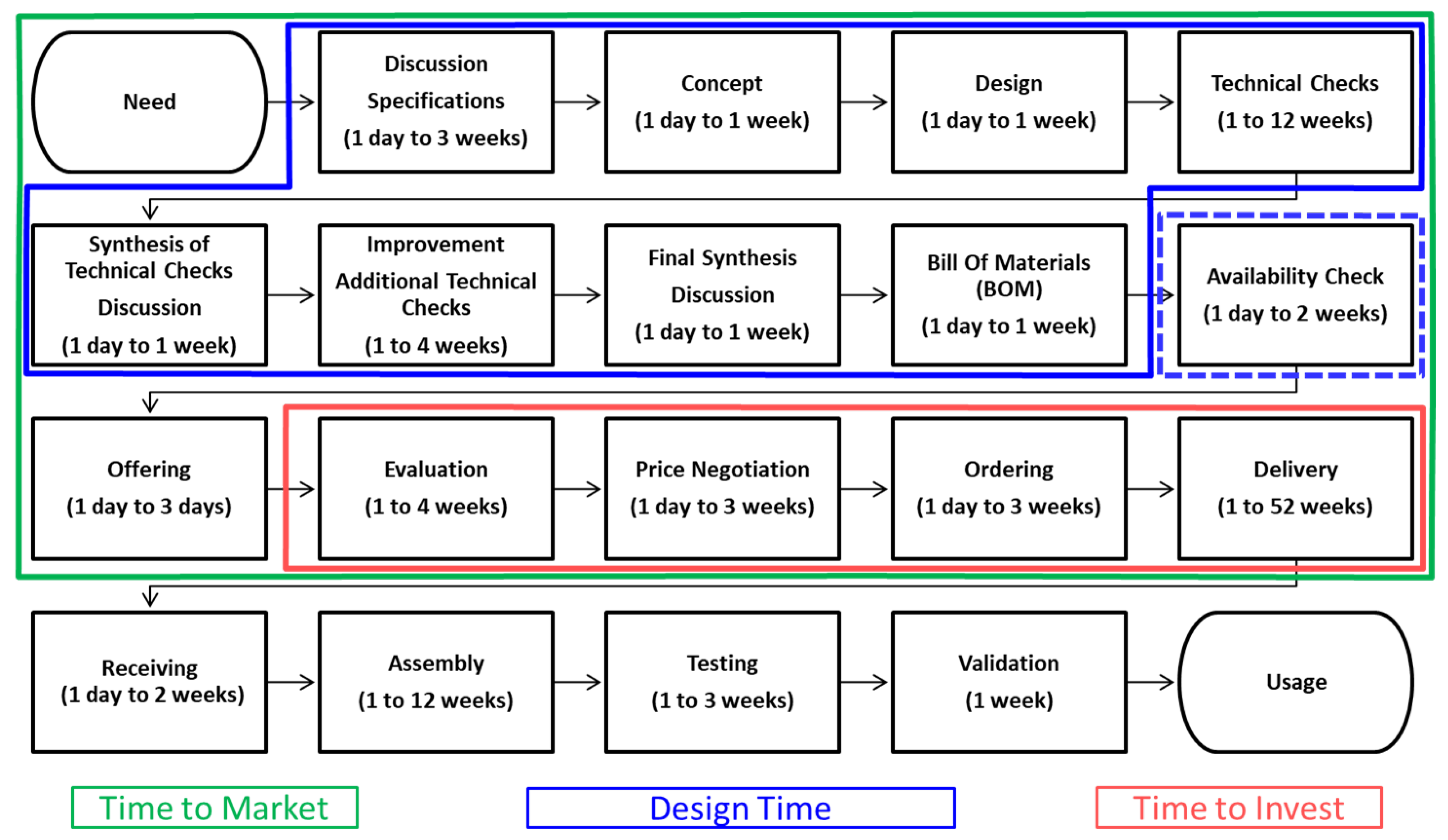 - TtoM, which spans between the expression of the need and the delivery of the goods (for a timely, successful design, this last step must be specified). In ETO projects, TtoM depends on agreed deliverables with the D, not necessarily on the market availability of the released design. In that case, TtoM is achieved when the components are duly delivered within the specified timeframe (even if the machine remains unassembled, untested, and unvalidated). The time effectively consumed by the design process to practically provide a given satisfactory design, that is, here, a given BOM of satisfactory components, is the TPT. The design process is successful when . In the other case, the process fails. In the CDP, availability check and offering steps are usually not done by the D but entrusted to other teams (e.g., internal sales, logistics, customer service).