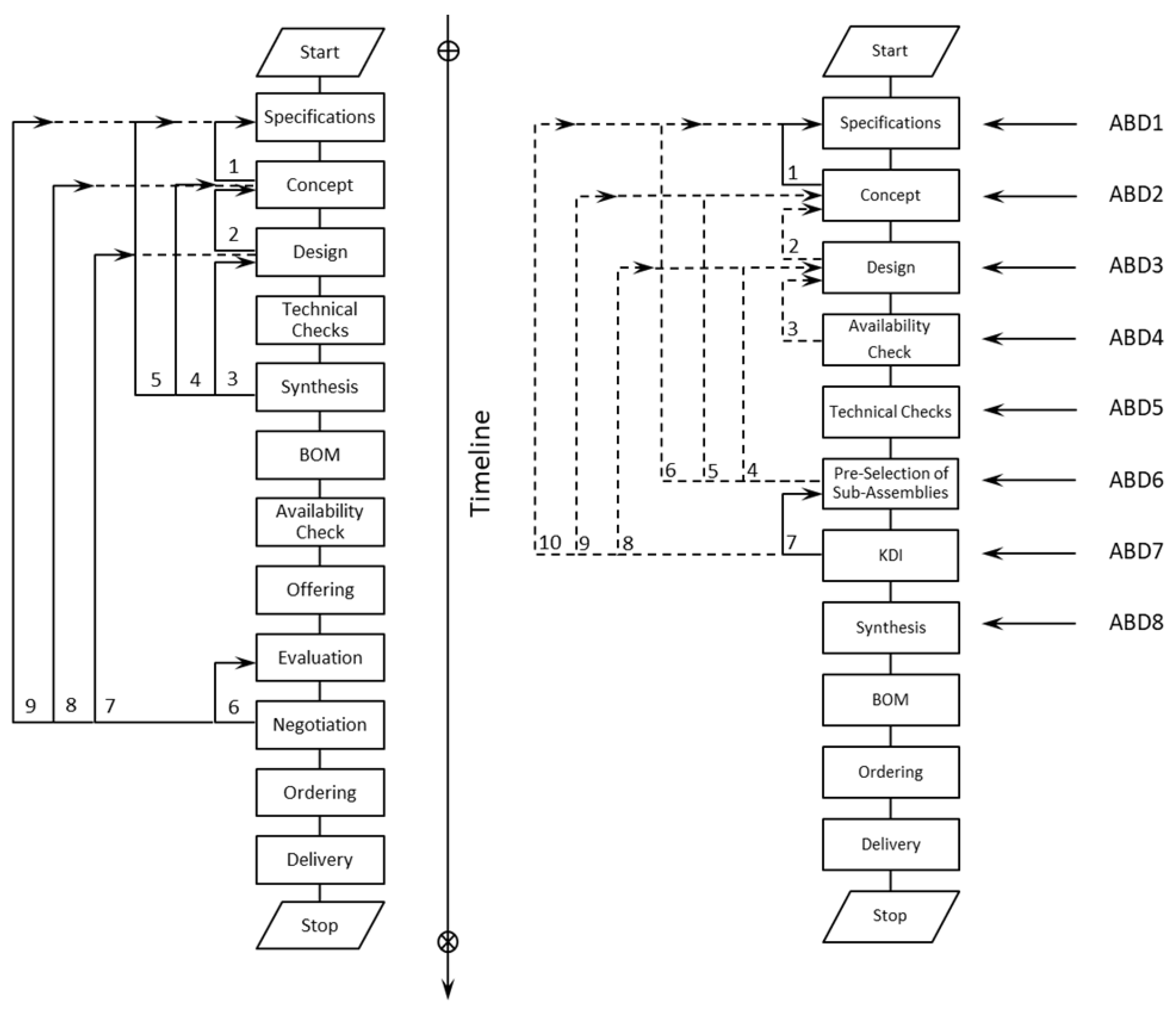 - Manual design is performed without the assistance of a computer-aided system. Printed or online technical catalogs are consulted to pre-select standard components, and straightforward design-documented calculations (by hand or with low-tech tools) are performed. After technical checks (TC) and global properties are performed, the synthesis and the BOM are established manually and transferred to other teams (“over the wall” approach) for checking BOM availability. This is usually realized from requests for quotation done by the purchase department to different suppliers. Offers are received, examined, and summarized to identify the best delivery times of BOM components. All this process is realized manually, which takes time. This method of design concerns specifically engineering offices (e.g., assemblers) that are treating non-recurrent machine designs. It may also concern completely new designs where engineering design, overall TC to be performed, and their orders of magnitude are not mastered enough. In these cases, the D wants to understand more accurately the relevant influencing parameters, and feels the need to explore the overall calculation protocol. These engineering offices generate individual designs after having performed the necessary TC manually. For completely new designs, R&D purposes, prototypes, or critical applications (e.g., where the 4-eyes principle is required), manual design is usually the way projects are managed in engineering to order design offices.