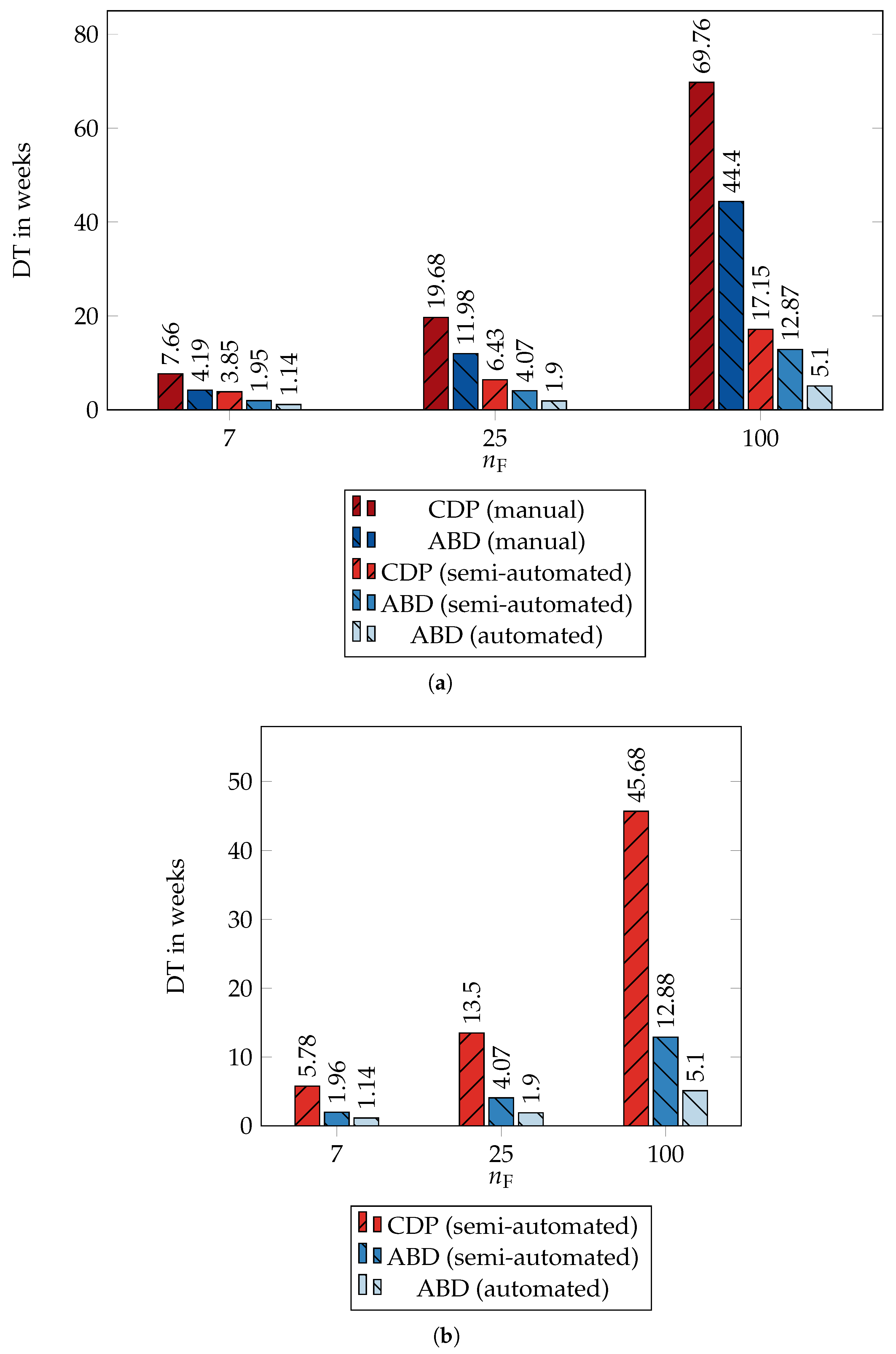 - Specifically at high availability ratios (full availability, ), when the design process is performed manually, CDP becomes more efficient than ABD;