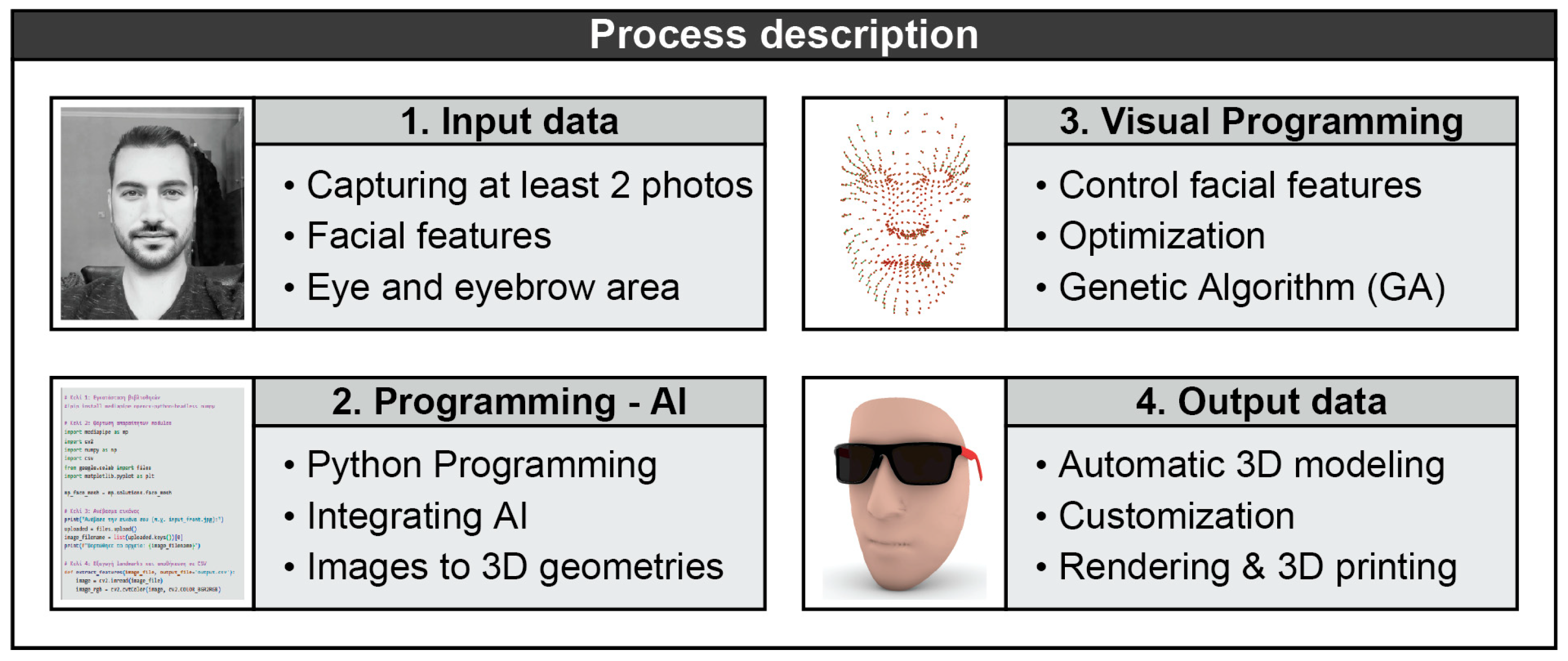 The primary objective of this study is the development of a custom sunglasses design application. The proposed application integrates Artificial Intelligence (AI) and Computational Design tools to automate the various stages of the design process. The system is structured into the following four main levels: (1) Input Data, (2) Programming–AI, (3) Visual Programming, and (4) Output Data. At the first level, the user captures between one and five selfie-type photographs. These images must focus on the facial region and clearly display key facial features. Slight variations in the viewing angle between photographs are required, as they enhance the accuracy of the design process. At the second level, facial features are identified using AI-based methods. Feature recognition is performed simultaneously across all input images. Facial features are represented as sets of points in three-dimensional (3D) space, with each set corresponding to an individual photograph. At the third level, alignment is carried out among all point sets. This alignment is achieved through an optimization-based algorithm, which is described in detail in the following section. At the fourth level, the sunglasses design process is fully automated. The geometry of the frames is generated based on the proportions of the user’s facial features. In parallel, rendering processes—including material assignment, texturing, and lighting—are applied, and a digital fitting of the sunglasses onto the reconstructed 3D facial model is performed.