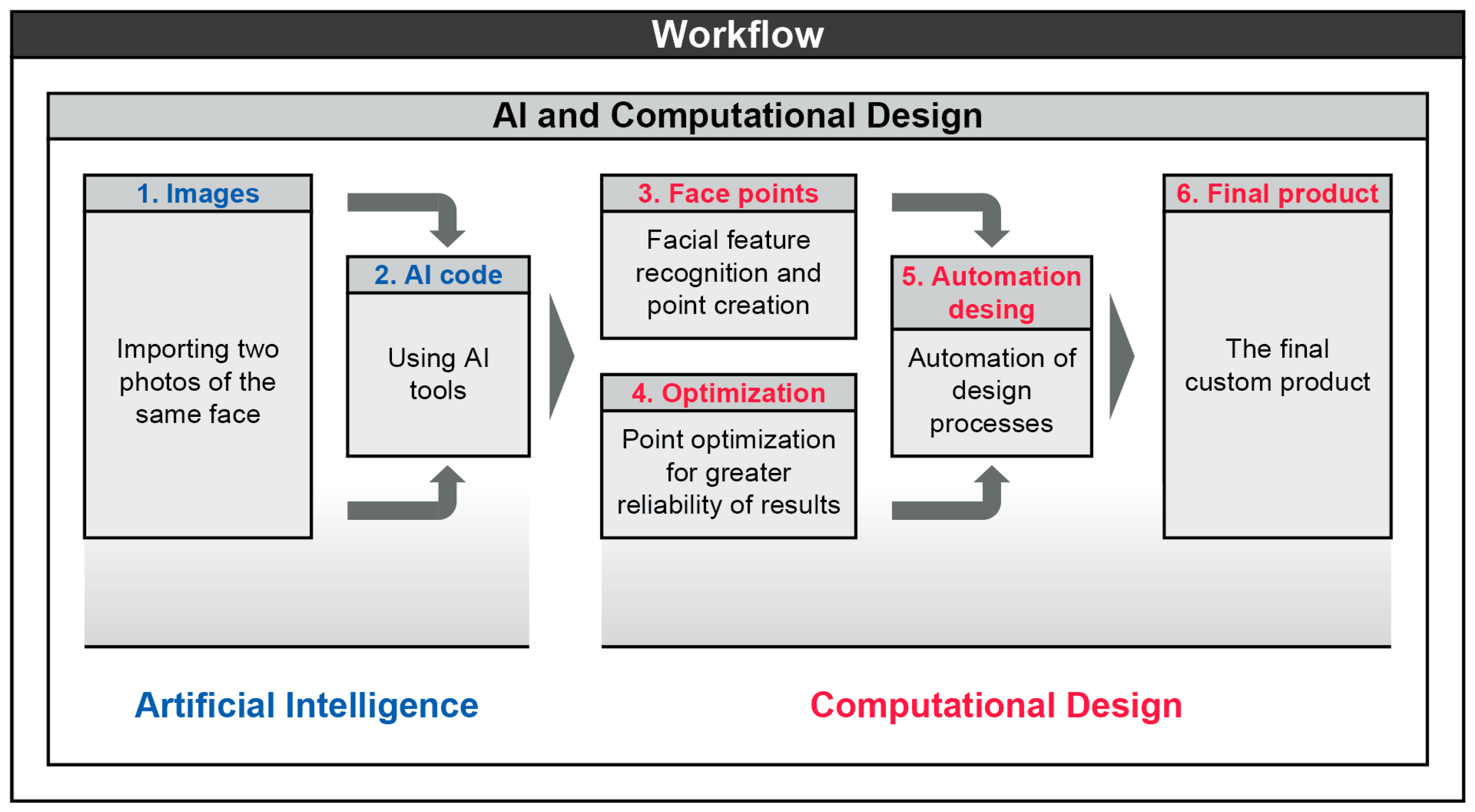 Figure 2 illustrates the two main pillars (AI and Computational Design) and the six stages of the workflow, as follows: image acquisition, AI processing, facial point generation, optimization, automated design, and final product output.