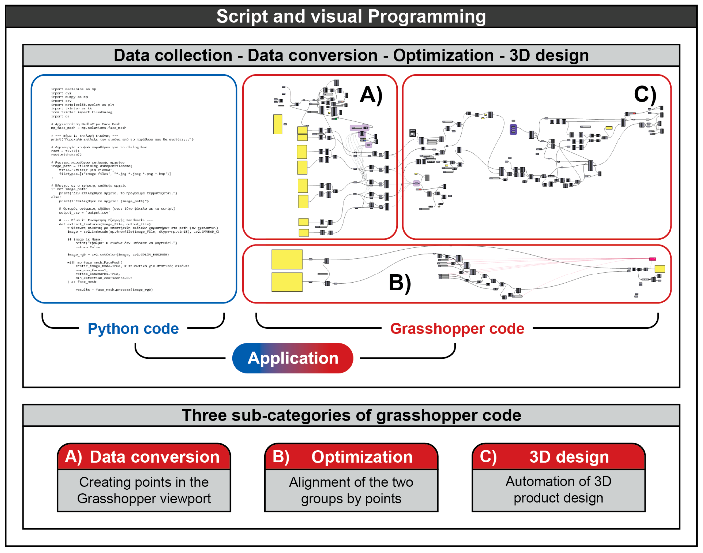 At this stage, the tools and workflow of the proposed design application are described. The operation of the application is structured around two main pillars. The first pillar is based on Artificial Intelligence (AI) implemented through Python™, while the second pillar relies on Computational Design using Grasshopper 3D™. Within the first pillar, the Python™-based AI module processes facial images and converts them into three-dimensional (3D) point representations. Once the generation of 3D point data is completed, the workflow transitions to the second pillar. The extracted 3D point coordinates are imported into Grasshopper 3D™ as a list of spatial coordinates and reconstructed as points within the parametric design environment. An optimization algorithm is then applied to align the point sets obtained from the different images. Through this optimization process, the individual point sets converge, resulting in a single consolidated set of points that integrates information from all input photographs. This final point cloud accurately represents the user’s facial features and is subsequently classified according to anatomical regions. Through this classification and filtering process, points corresponding to critical facial areas that approach or come into contact with the eyeglass frame are identified and isolated. Based on these filtered facial features, the eyeglass frame is generated using parametric design tools in Grasshopper 3D™, enabling the fully automated design of the final product.