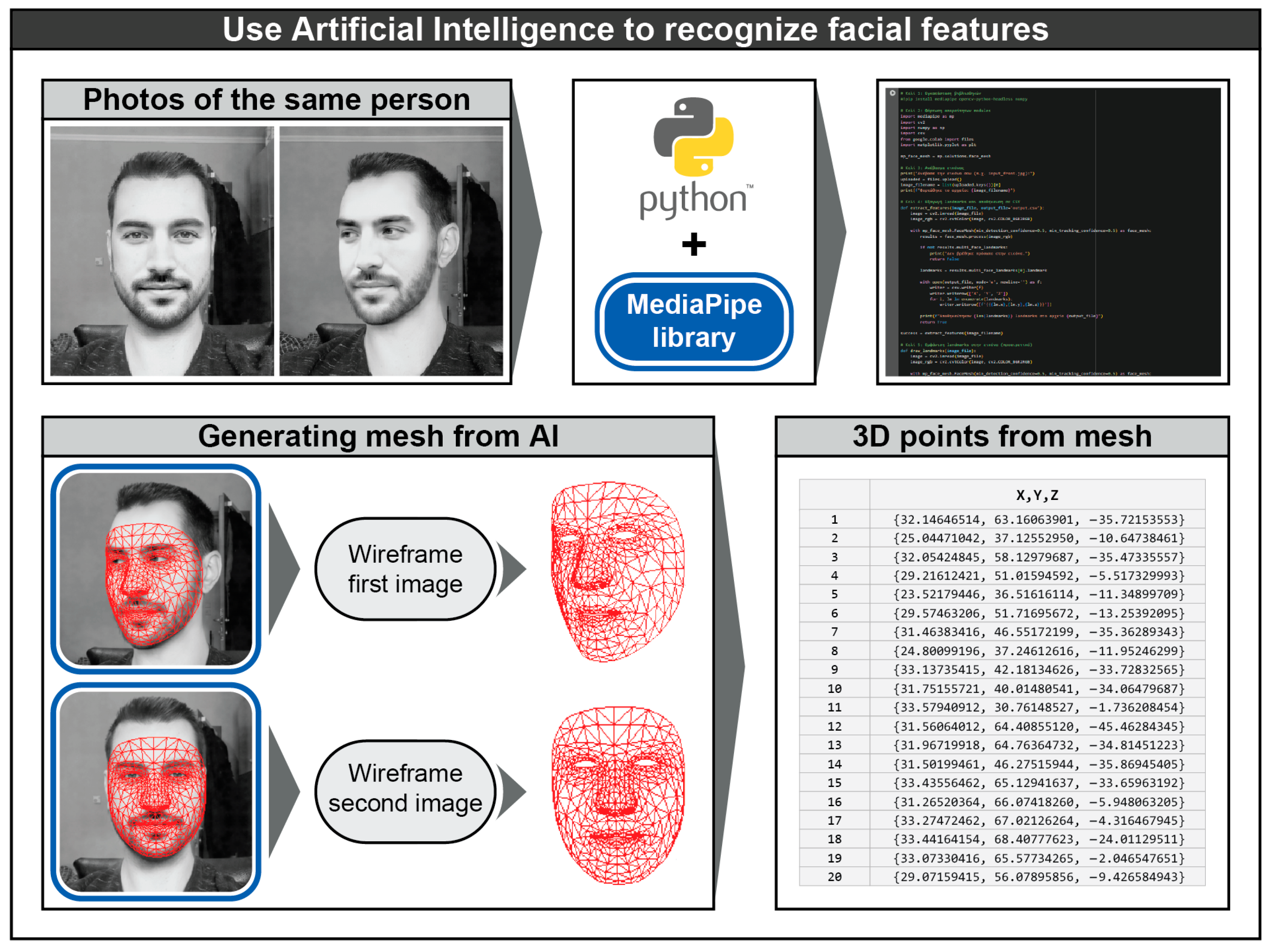 TM version 3.10.7 libraries). At this point, the user can qualitatively evaluate the success of the recognition of the facial features and is given the option to continue or repeat the process. At the end of the code, the coordinates of the points are exported in CSV format according to a specific formatting. The formatting is presented through three examples (1).