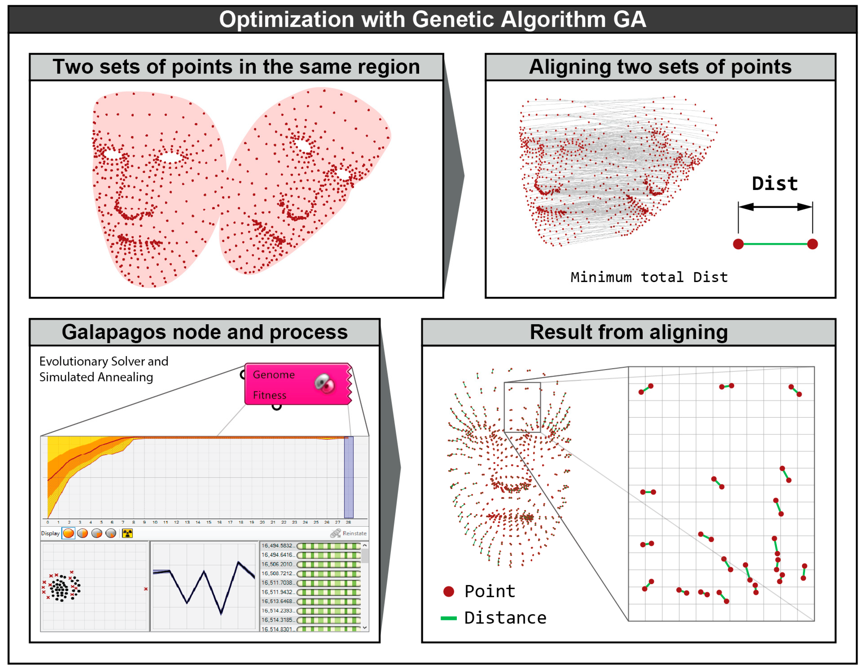 Z-axis (rz), and (7) uniform scaling (sxyz). Scaling is constrained to be uniform to prevent distortion of the point set, which would otherwise alter the proportional relationships between facial features. Uniform scaling preserves these proportions while allowing the overall size to be adjusted, as final dimensional calibration is performed in later stages of the process. The objective of the alignment procedure is to minimize the sum Σ of all Dist values after the transformation of the point sets. To solve this optimization problem, the Galapagos™ solver within Grasshopper was employed. Galapagos™ is an optimization engine that iteratively modifies input variables and evaluates their effect on a predefined objective function, which can be either maximized or minimized depending on the problem formulation. In the present case, the objective function is the minimization of Σ(Dist). Galapagos™ repeatedly evaluates new combinations of transformation variables until convergence toward an optimal solution is achieved. In the example presented, Galapagos™ required 3 min and 12 s to determine the optimal values for the seven transformation variables. Notably, within the first 40 s, the solution had already converged to 98.87% of the final optimal value. The optimization was performed using a Genetic Algorithm (GA), which is inspired by the principles of natural selection and biological evolution. For comparison, a Simulated Annealing (SA) algorithm was also tested, but it required significantly longer computation times to reach a comparable solution [
