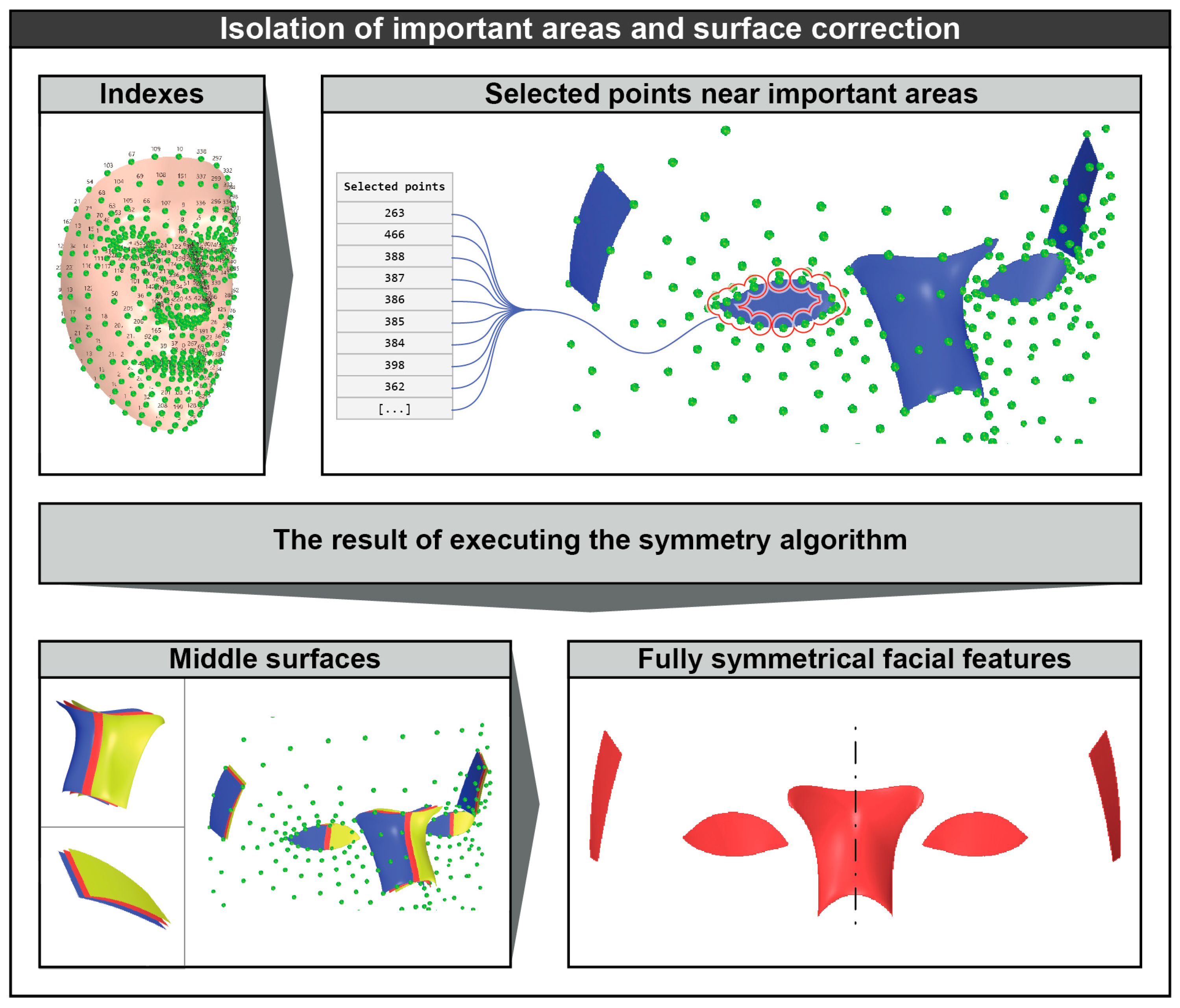 Figure 6, the blue surfaces correspond to the left facial features, the yellow surfaces to the right facial features, and the red surfaces represent the generated mid-surfaces.