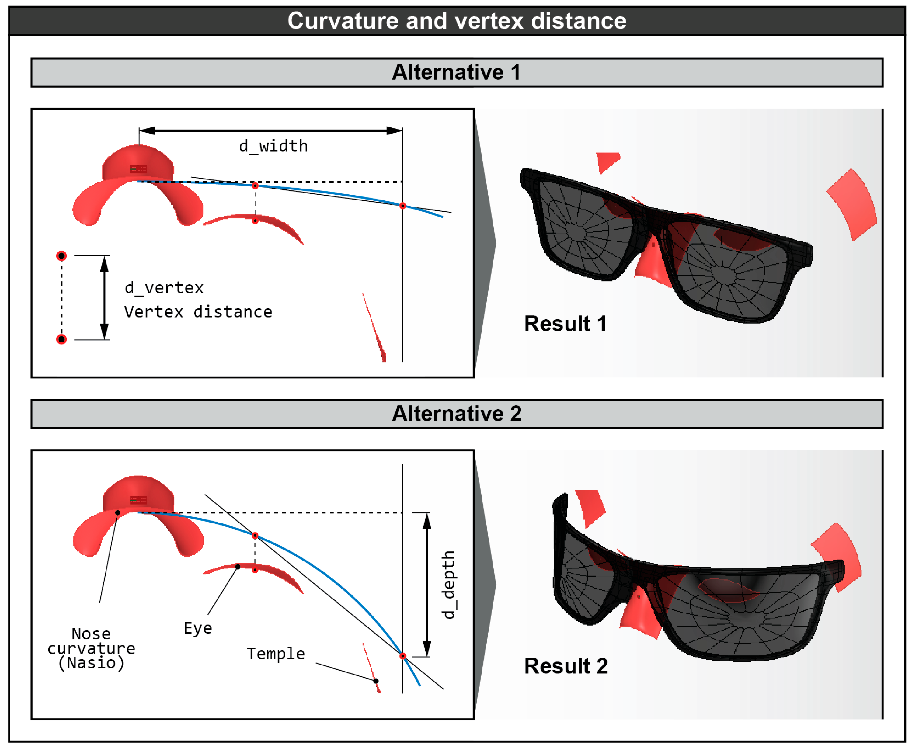 Figure 7 shows the dimensions d_width, d_vertex, d_depth, and the curve of the arc with two variations. In each variation, a different depth of the eye is used in relation to the reference point (upper part of the nose). At the same time, the 3D result of the geometry of the glasses of each variation is presented.
