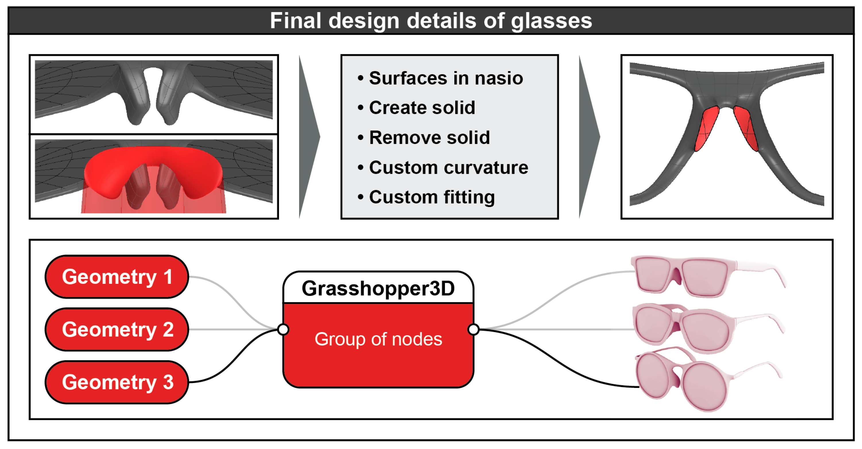 Figure 8 shows the creation of a custom surface in the contact area of the glasses with the nose, as well as the assorted styles of glasses frames.
