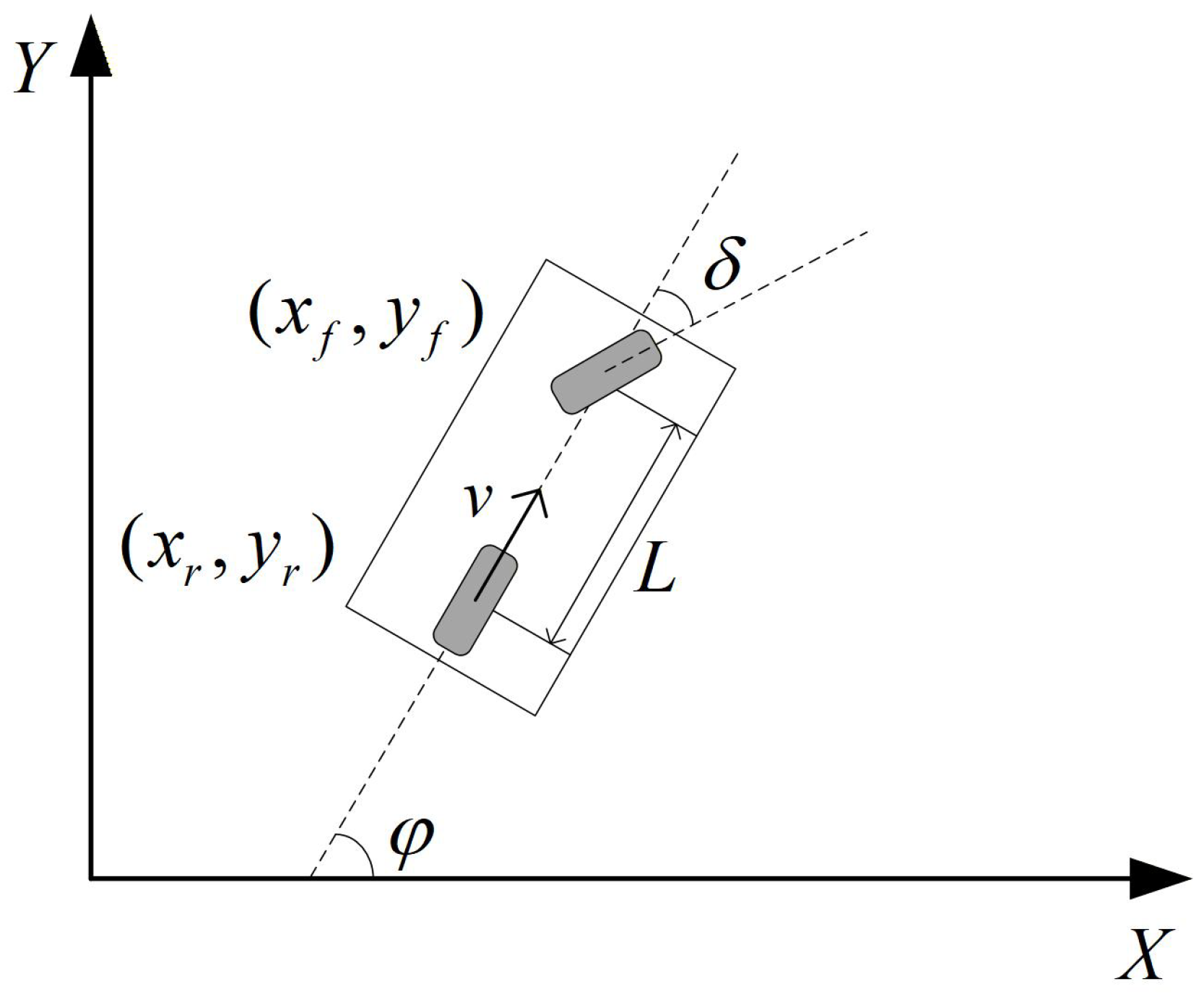 As a non-holonomic mechanical system, the motion of the front and rear wheels must satisfy non-holonomic constraints: