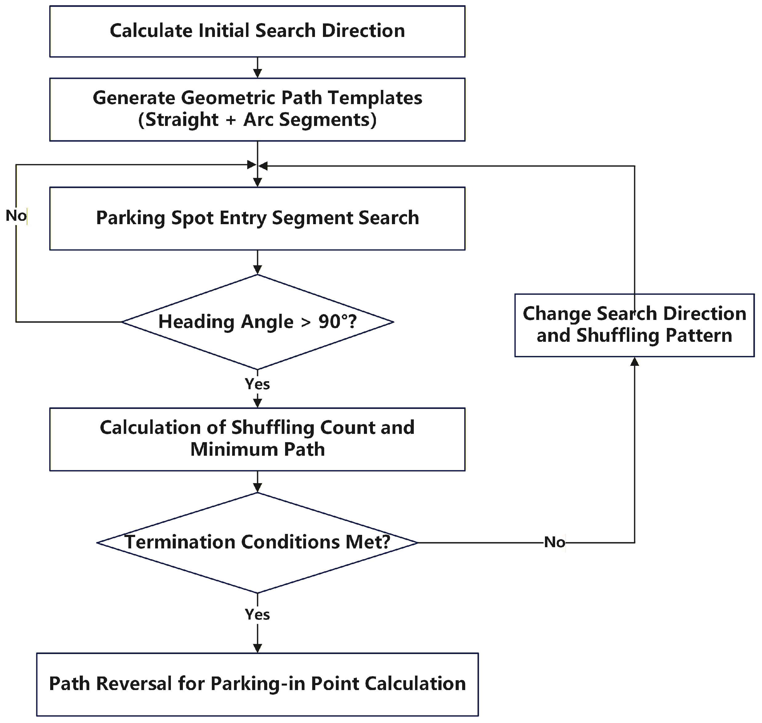 Figure 6, the algorithm starts from the parking endpoint and performs iterative shuffling adjustments to conduct a reverse search for a geometric path that extends outward from inside the parking space while satisfying collision constraints. The outermost point on this path that exhibits a feasible and well-conditioned vehicle pose is defined as the parking entry point. This point is then used as the target input for the subsequent global planner, thereby decoupling the complete parking task into two subproblems: global navigation from the vehicle’s initial pose to the parking entry point, and precise local execution from the entry point to the final parking endpoint.