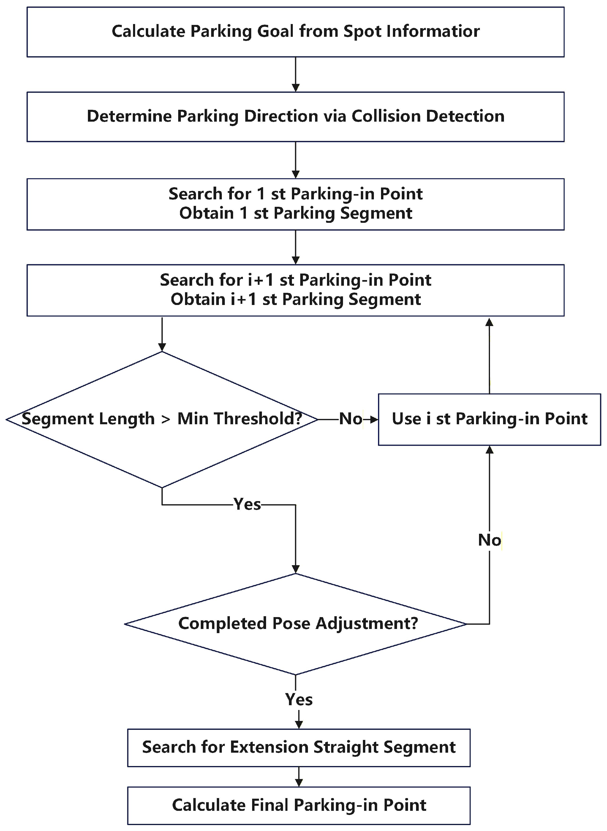 , the segment is considered infeasible and the endpoint of the previous valid segment is directly taken as the parking-entry point. If the length requirement is satisfied, a heading-consistency search is performed backward from the endpoint to determine whether there exists a point whose heading