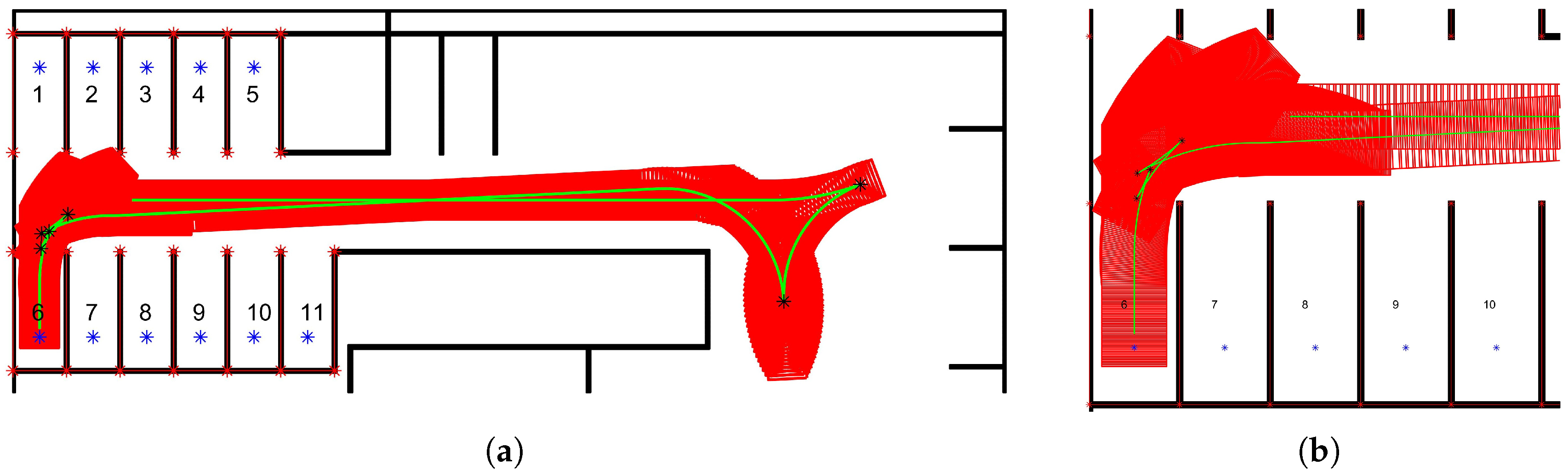 Figure 18 illustrates the planned trajectory for the vertical parking experiment. The vehicle starts from its initial pose along the lane and, guided by the entry point, performs a single reversing maneuver along a smooth L-shaped path to park precisely into the perpendicular space. Notably, in the critical region near the parking entry, the planned path incorporates local multi-point shuffles to achieve fine orientation corrections, allowing the vehicle to efficiently avoid surrounding obstacles. This demonstrates the proposed algorithm’s ability to generate feasible and well-structured parking paths under tight geometric.