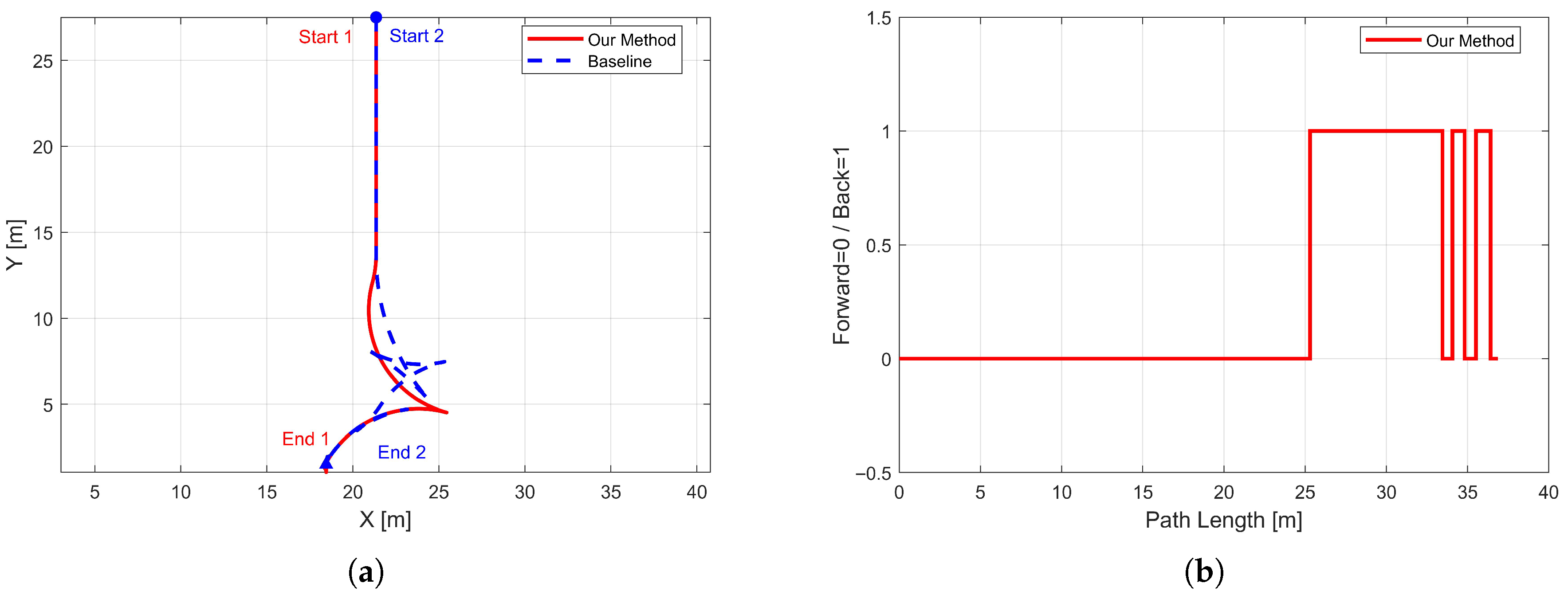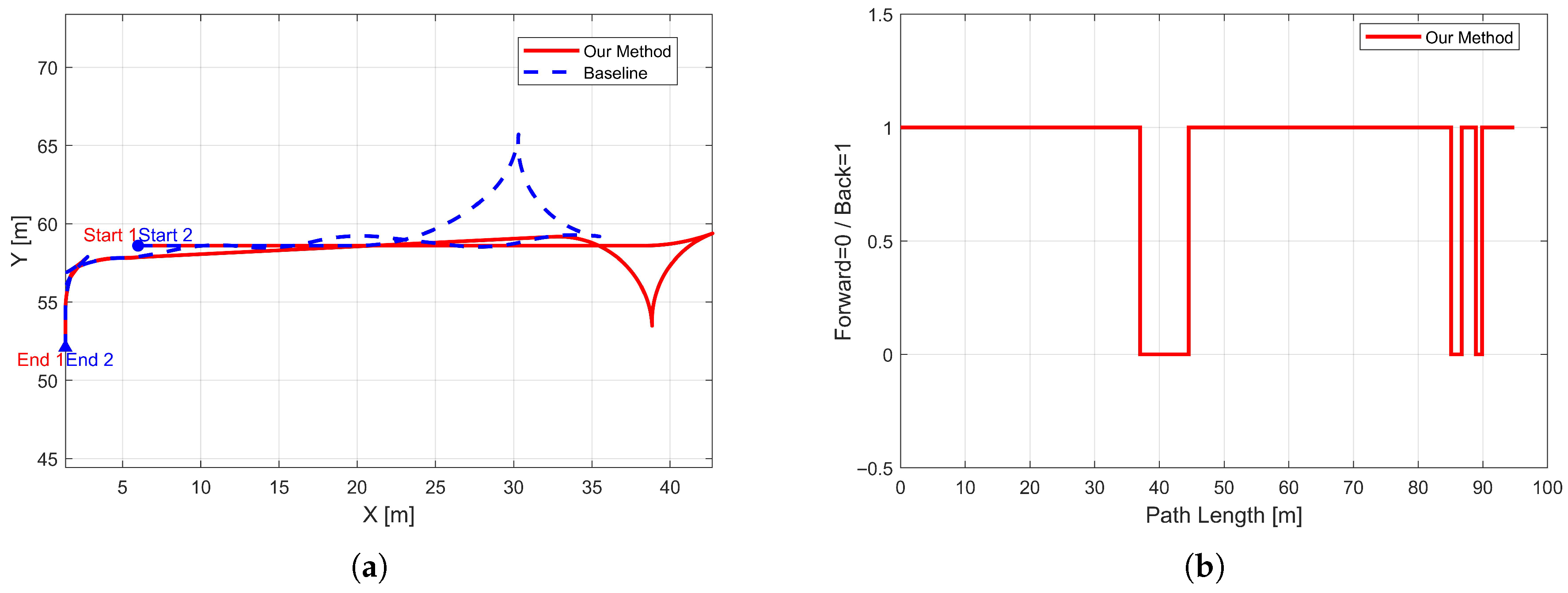 Figure 8b shows the variation of driving direction along the path length, highlighting a regular “forward–reverse” switching pattern in the central section of the trajectory. This pattern directly reflects the maneuvering operations, with smooth transitions and gentle switching frequency, indicating that the strategy not only satisfies geometric constraints but also mimics human driving behavior. Such smooth direction changes reduce abrupt gear shifts, benefiting both actuator control and passenger comfort.