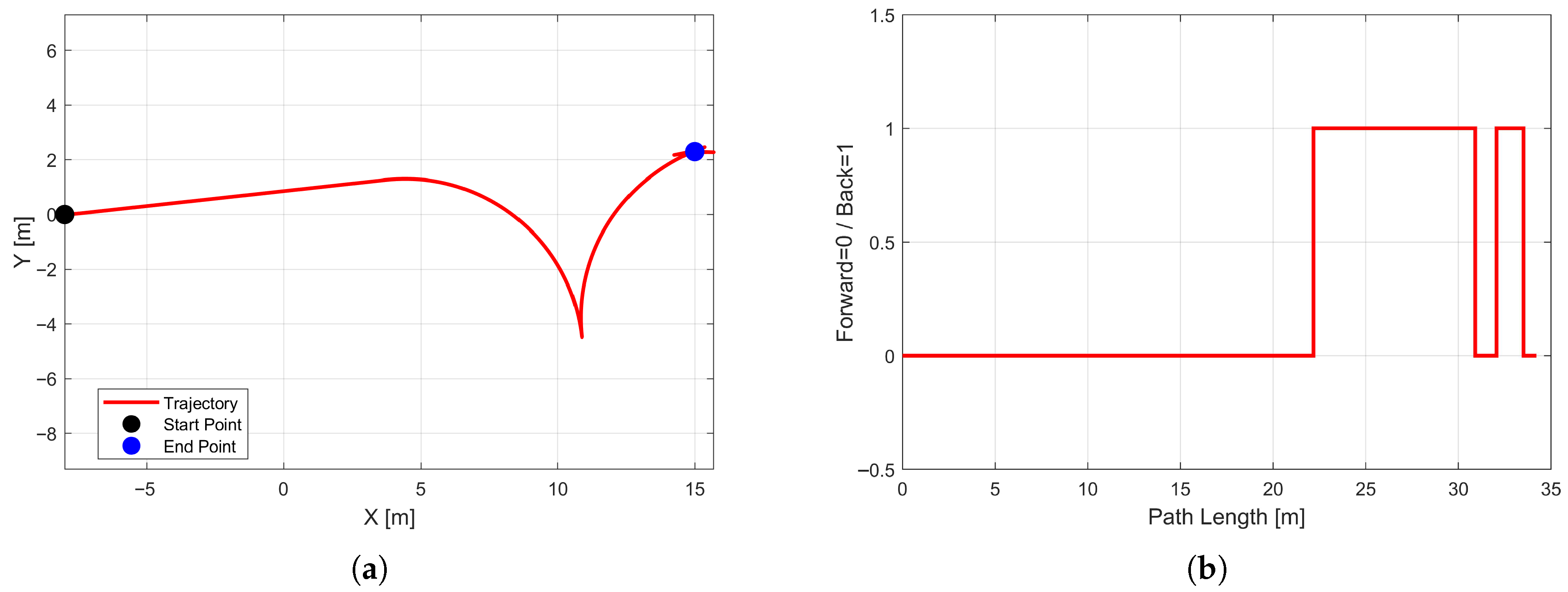 Figure 15b depicts the driving direction along the planned path length. In the path segment corresponding to the maneuvering phase, multiple regular “forward (+1)–reverse (–1)” switches can be observed. These switching points are smoothly connected and reasonably distributed in the path parameter space, indicating that the proposed planning algorithm can generate well-structured and logically ordered maneuvering sequences in confined environments, without introducing unnecessary direction changes, thereby providing a solid feasibility basis for subsequent vehicle execution.
