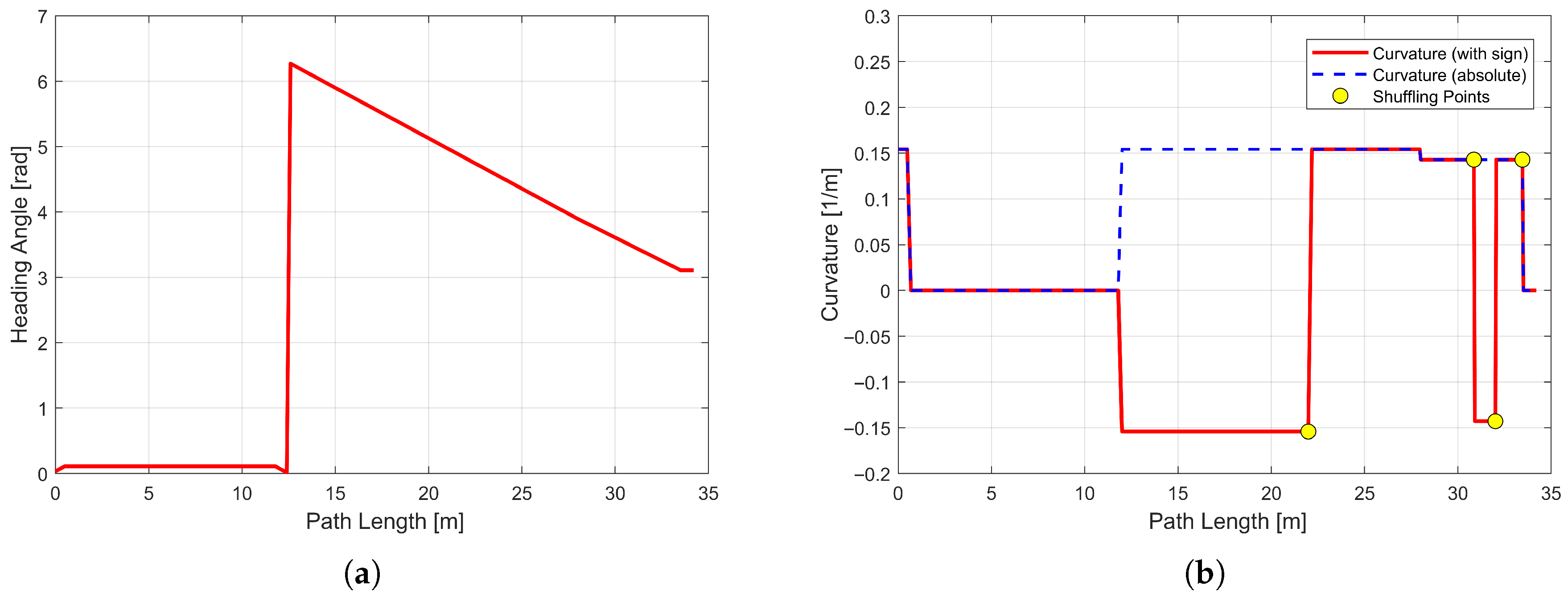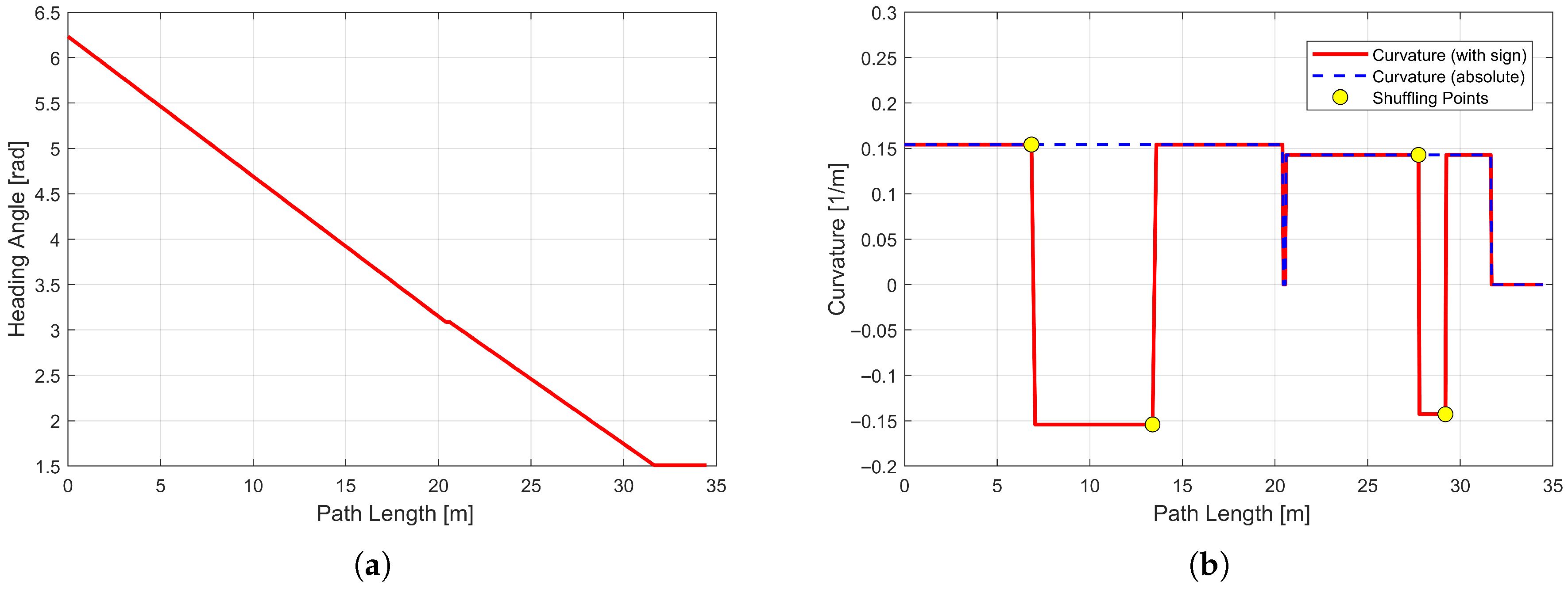 Figure 16a shows the heading angle variation along the planned path. Throughout the parking process, the heading angle evolves from an initial orientation approximately parallel to the lane, changes gradually during the maneuvering phase, and ultimately aligns with the parking space. The heading profile exhibits a continuous and smooth S-shaped trend, indicating gradual and reasonable orientation adjustments along the planned path.