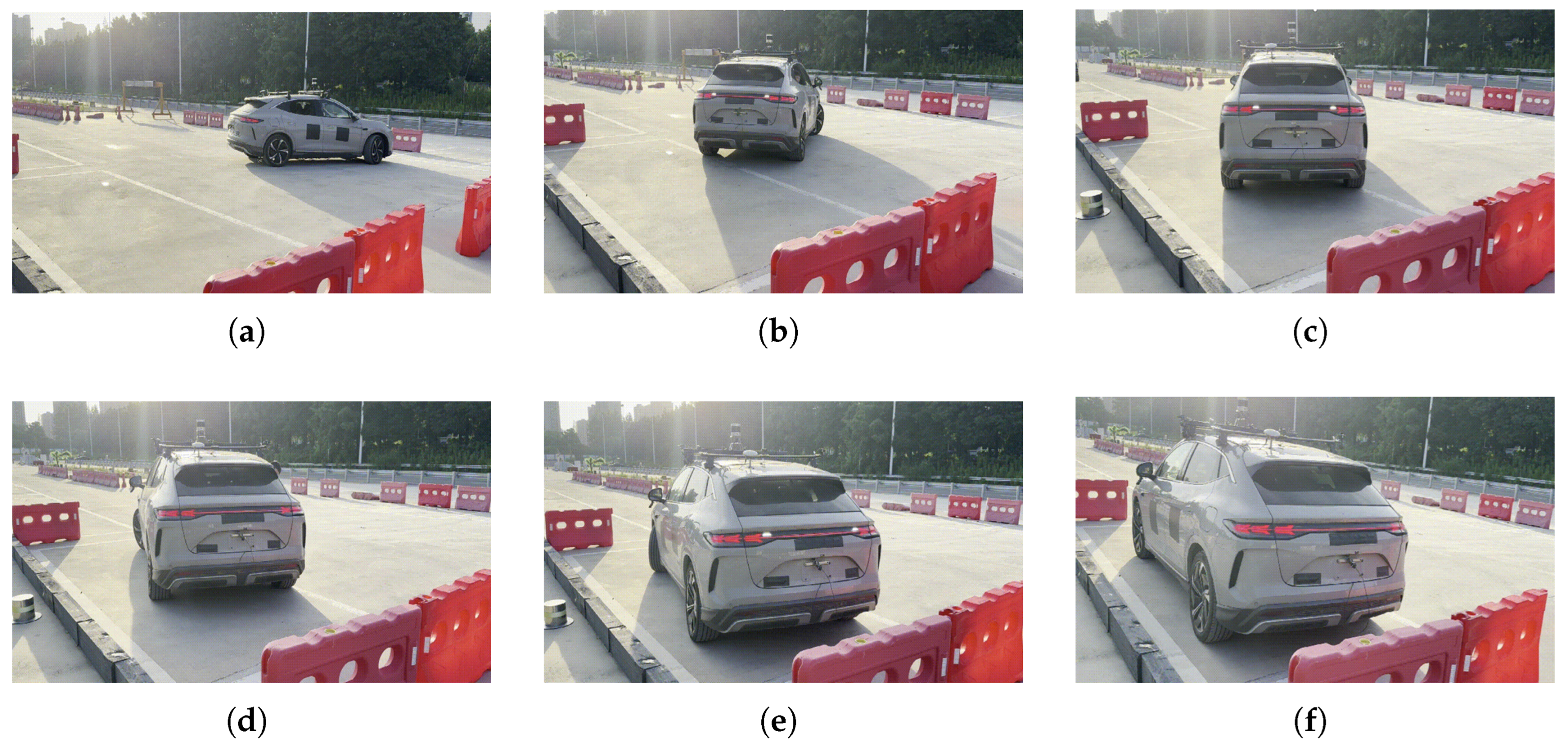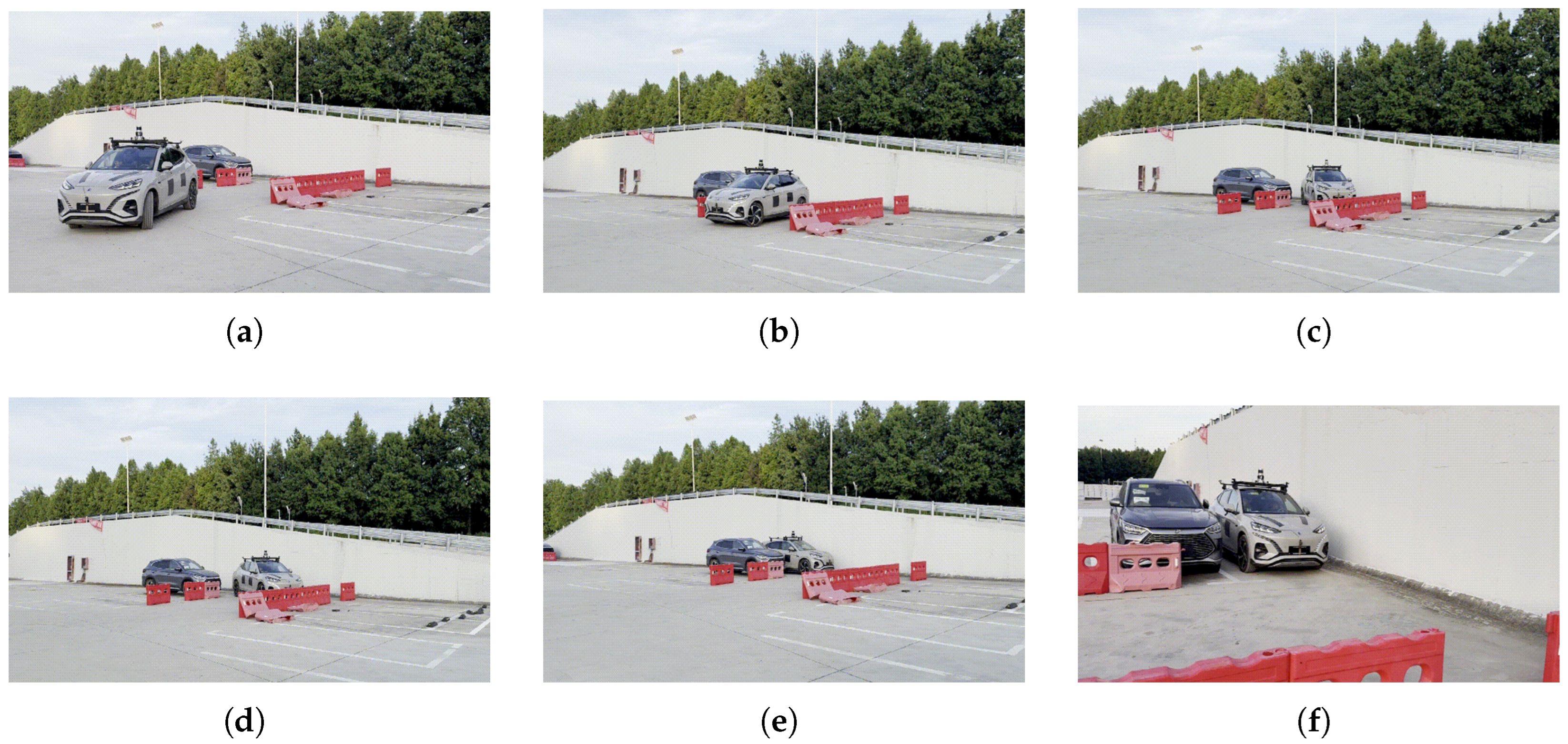 Figure 17 presents a sequence of on-site photographs from the real-vehicle parallel parking experiment, providing an intuitive visualization of the planned path execution in a real environment. Panels (a)–(f) chronologically illustrate the vehicle starting from the initial preparation pose, performing multiple maneuvering adjustments along the planned path, and finally completing the parking operation in the target space. From an engineering perspective, these observations demonstrate that the proposed path planning method is capable of generating parking trajectories with reasonable structure and well-organized maneuvering logic in real and complex environments, highlighting its practical applicability constraints.
