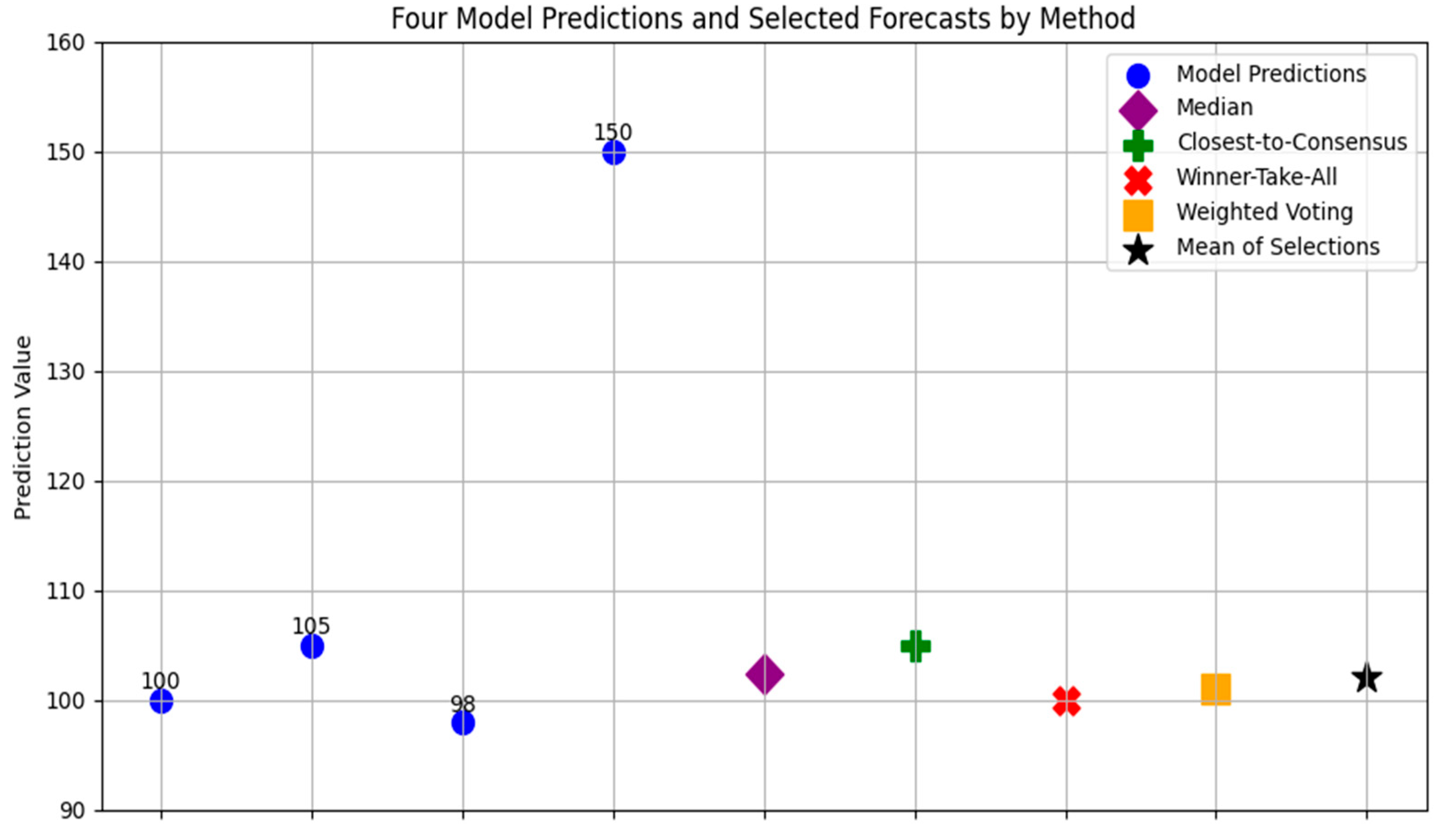 Figure 4. We propose, in this work, to use the mean of the previous four selections (median method result = 102.5, closest-to-mean result = 105, winner-take-all result = 100, and instantaneous weighted pooling result = 101) that is equal to 102.125. These methods have been widely discussed in the literature and provide a systematic way to improve forecast accuracy when multiple models are available without relying on historical performance or external meta-features [