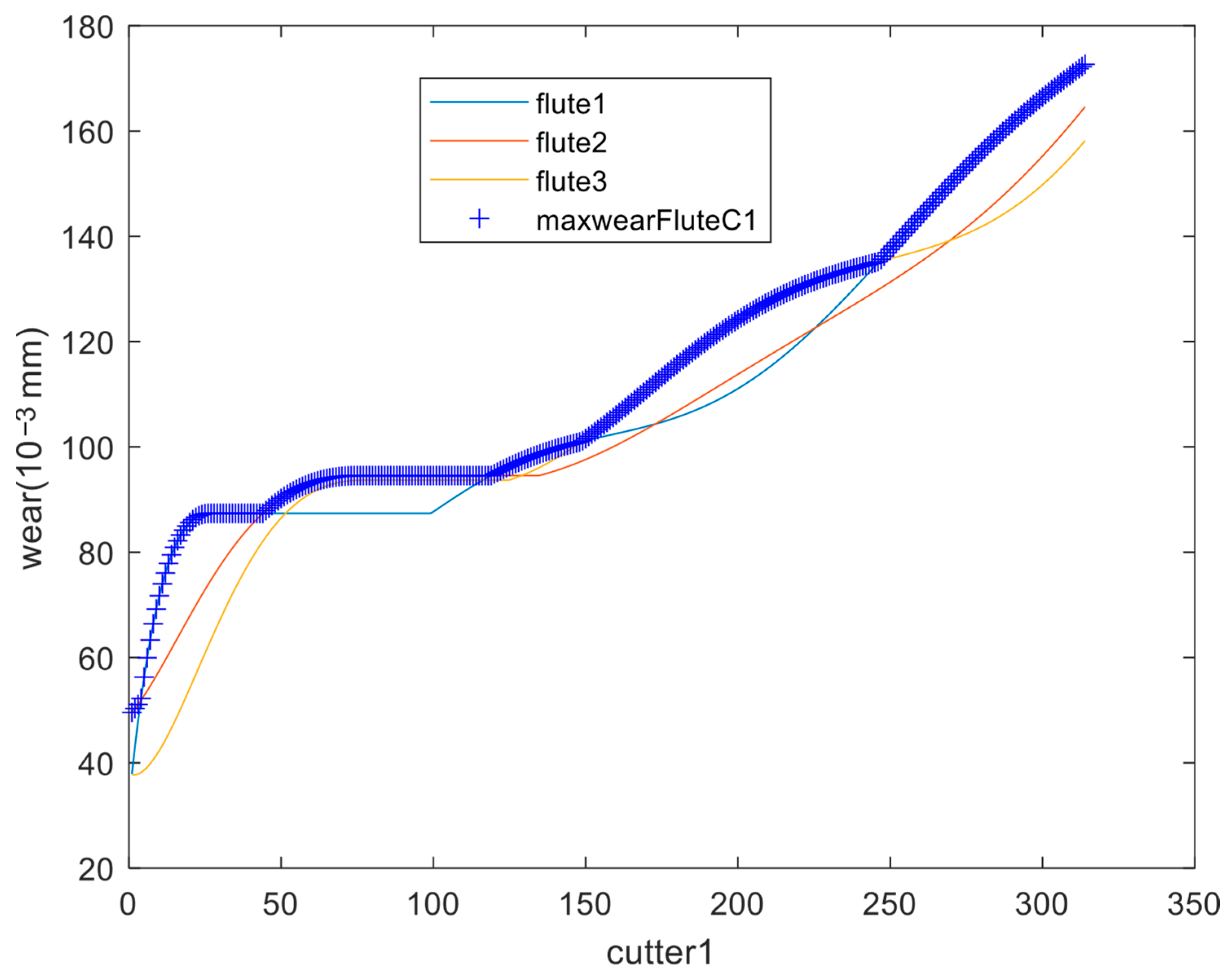 Figure 5 shows the wear evolution of the cutter C1 in the three flutes and the maximum wear of them. The maximal accepted tool wear is 0.165 mm to standardize the condition monitoring of milling tools and to facilitate the development and evaluation of predictive models for tool wear and RUL. This threshold is intentionally set lower than the typical industrial standards that suggest for any CNC tool to be replaced when flank wear (VB) reaches approximately 0.3–0.6 mm.