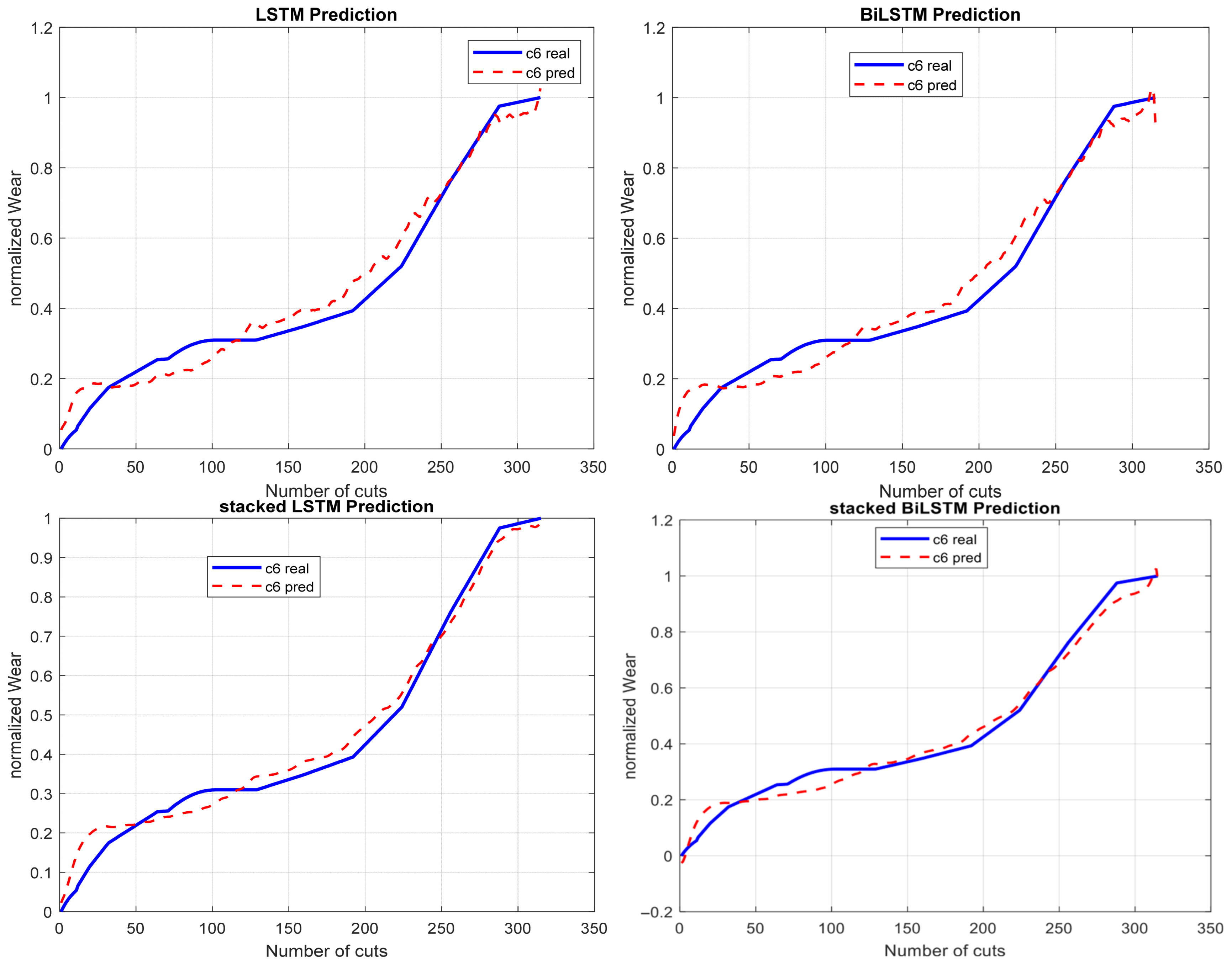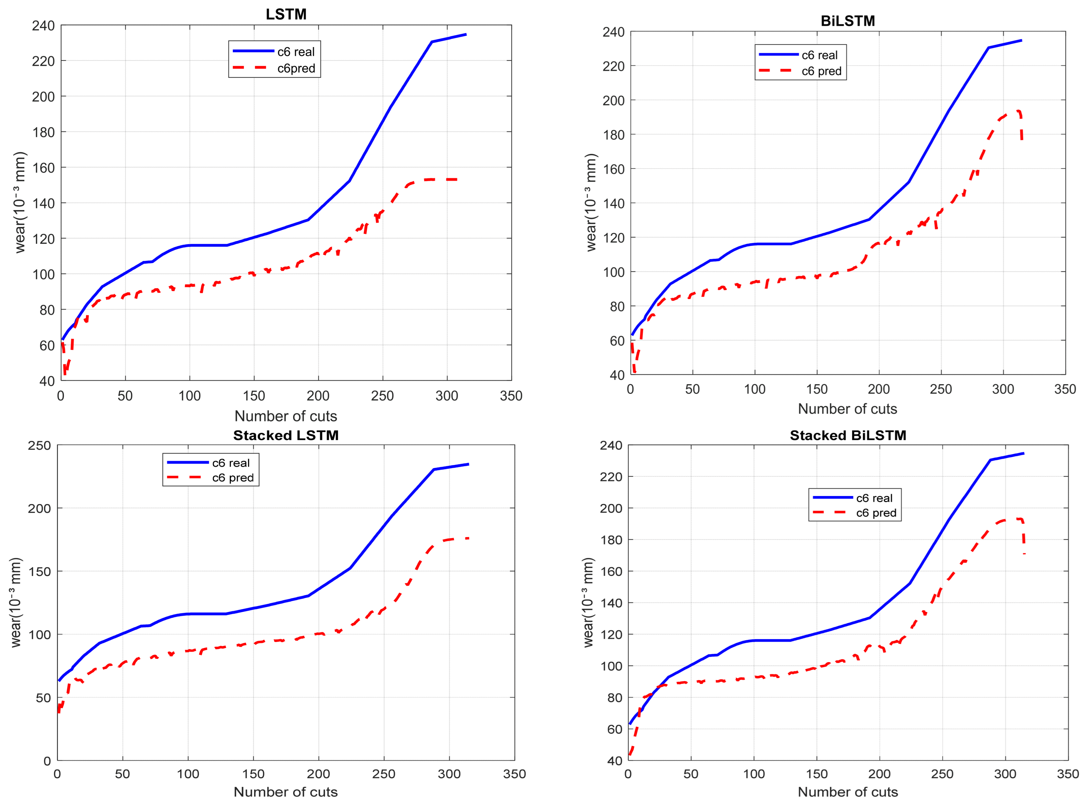 Figure 6 presents the prediction degradation results of milling tool wear using LSTM, BiLSTM, Stacked LSTM, and Stacked BiLSTM models. The cutters C1 and C4 are used for training the models using original recorder signals and the cutter C6 was used for testing. All models closely follow the trend of the real wear, demonstrating their capability to capture the tool degradation pattern, even if they do not fully converge to the exact measured values. In many previously published studies, an 80/20 random split of data from the same cutting tool run-to-failure history is commonly adopted, with 80% of the data used for training and the remaining 20% for testing. However, for time-series forecasting problems, such a strategy may introduce data leakage as degradation patterns from the same cutting tool can appear in both subsets. To provide a more realistic evaluation of model generalizability, a cutting-tool-level split (i.e., a leave-one-case-out assessment) was employed in this study. Specifically, the complete run-to-failure histories of cases C1 and C4 were used for model training, while the full run-to-failure history of case C6 was reserved exclusively for testing.