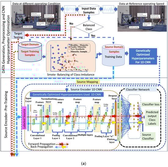 The flow chart of the proposed methodology is shown in Figure 2, and technical details are shown in Figure 3a,b. In the first phase, data generation and pre-processing were carried out. In the second phase, adversarial learning was implemented, and in the third phase, testing of the target domain data was performed.